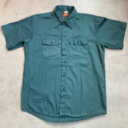 ~70's Dickie's ディッキーズ 半袖ワークシャツ チェーンステッチ Schumann Building seravice Inc ダークグリーン サイド内縫い 襟芯 Lサイズ 希少 ヴィンテージ BA-1145 RM1514H
