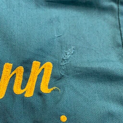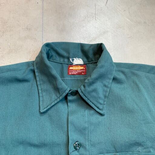 70年代前後のDickie's半袖ワークシャツです。コットンポリエステルのやや光沢のある生地が使われています。襟芯が入り、サイドは内縫い仕様です。背面にチェーンステッチが施されており、ビルのメンテナンス等を手がけていた会社で使われていたのでしょうか。チェーンステッチ横に少しダメージがございます。フロントポケットがやや中央に寄っている感じがおもしろいデザインだと思います。ディッキーズは古着市場でも目にする機会が多いブランドですが、そのほとんどは80年代以降の比較的年代の浅いアイテムがほとんどで、80年代以前のアイテムは以外と出ない印象があります。シミ汚れや毛羽立ちなどの使用感はございますが、ワークウェアの観点でいえば状態は良好だと思います。ボーリングシャツ等チェーンステッチが施されたアイテムがお好きな方は是非いかがでしょうか。