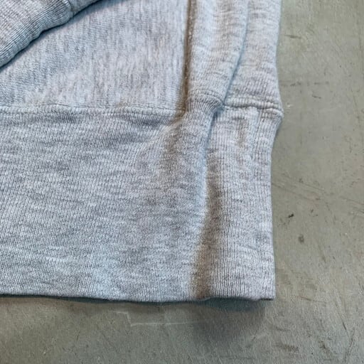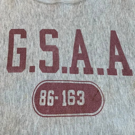80年代のChampionリバースウィーブスウェットです。首元のタグが欠損していますが、80年代のトリコタグが付いていたと思われる固体です。染込みでプリントされたG.S.A.A.にカプセルの86-163の色褪せた具合も雰囲気が良く、このデザインはWAREHOUSEがサンプリングして復刻デザインを販売していました。サイズはM~L相当。裾の撚れもほとんどございません。薄いシミや裾リブ裏にダメージ箇所がございますが、全体的には状態良好といえます。タグこそ欠損していますが、年々リバースウィーブは人気沸騰で状態やデザインの良いものはシーズンになると枯渇してしまいますので、早い段階で手に入れられることをお勧めします。