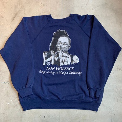 90年代頃のMartin Luther King, Jr. プリントスウェットです。アフリカ系アメリカ人公民権運動の指導者としてキング牧師の名で知られた偉人です。NON VIOLENCE(非暴力)主義を貫き、1963年8月に行われたワシントン大行進の最後に、かの有名な「I HAVE A DREAM」の演説をしたのがキング牧師でした。こちらのスウェットにはNON VIOLENCEのプリントと共に演説しているキング牧師が絵画タッチでデザインされています。プリントされているUAWは1963年8月の大行進の際公民権運動の先頭に立っていた全米自動車労働組合を意味しています。全体に若干毛羽立ち等の使用感はございますが、ダメージは特にございません。HanesボディのXLで、身幅はゆったりとしています。