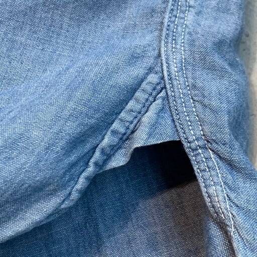 40年代から50年代頃のHERCULESシャンブレーワークシャツです。アメリカ3大ストアで知られるSearsがワークウェアを展開していたプライベートブランドです。襟はダブルステッチ、台襟仕様、ネイビーの2つ穴のベークライトボタン、胸ポケットにはペン刺しホール有り、袖や肩の主要部分はトリプルステッチ、サイドマチ付き。非常にシンプルなデザインで使いやすいアイテムです。首元に変色があり、ヨーク内側の生地が一部ほつれています。フロントにうっすらとシミがあり、右袖に小さなピンホールもございます。その他大きなダメージ等はございません。60年代以前のシャンブレーシャツは人気も高く、状態の良い物の出現率は低く今回のこの個体のようにコンディションの良い物は年々見つかりづらくなってきています。サイズ表記はございませんがL相当と思われます。着丈がやや長めなので、シャツインやオーバーオールのインナーに合わせると使いやすいのではないでしょうか。お探しだった方は是非この機会にいかがでしょうか。