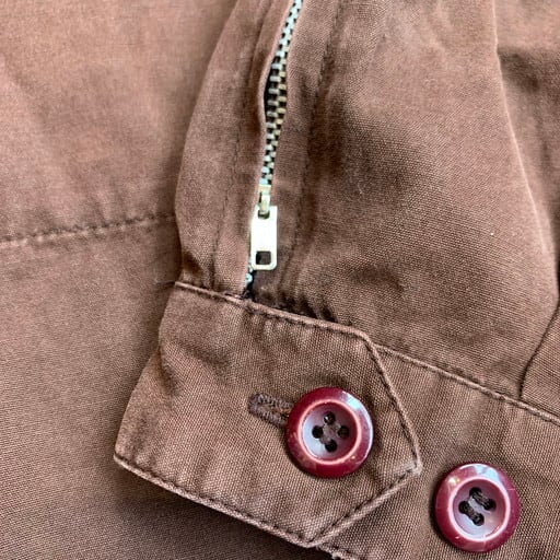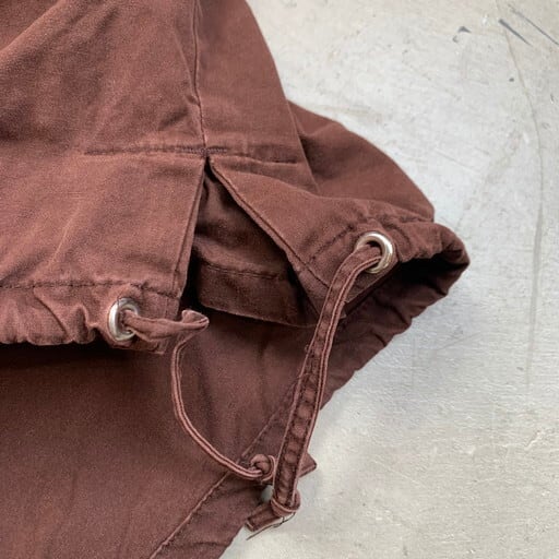 90年代頃のJ.CREW2トーンコットンアノラックパーカーです。アメリカンカジュアルブランドとして有名なJ.CREWの名作アイテムです。ブラウンとホワイトのバイカラー仕様で、張りのあるコットンが使われています。フード下にタバコサイズのミニポケット、フロントにはボディの半分を占める大きなカンガルーポケットがございます。袖口にもジッパーが採用されており、機能面とデザイン性に長けたアイテムです。右肩にリペアが有り、フード(白い生地)や背面フード下付近にインクのようなシミがございます。背面部分のしみに関してはフードで隠れますのであまり目立たないと思います。大きなダメージは無くグッドコンディションといえる1着です。XL表記で身幅はゆったりとしていますが、着丈は長すぎないので着易いサイズ感です。アウトドアとストリートをミックスさせたような旬なアイテムです。こちらのカラーは他の色の組み合わせに比べ個体数も少ないと思われ希少です。この機会に是非いかがでしょうか。