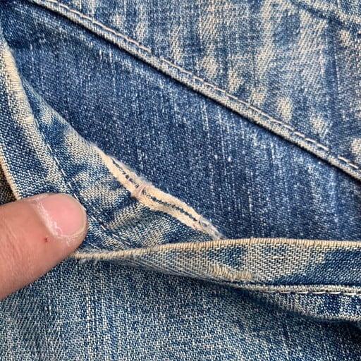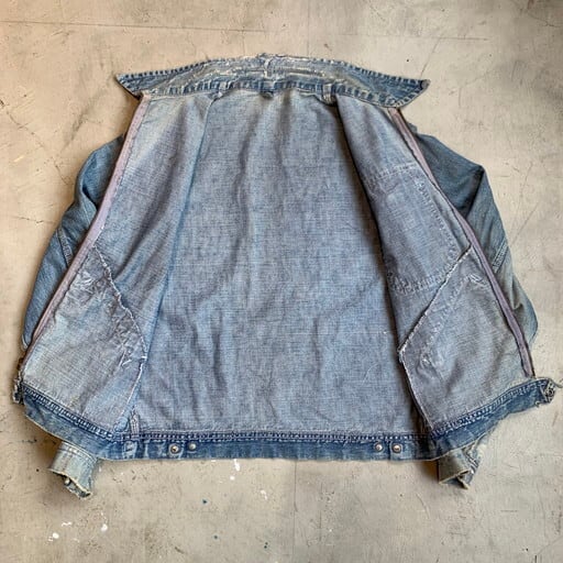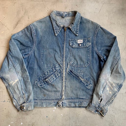 40年代から50年代頃のHERCULESデニムワークジャケットです。アメリカ3大ストアで知られるSearsがワークウェアを展開していたプライベートブランドです。フロントはWALDESのピンロックジッパーでコの字留めの古い仕様です。ポケット内側や袖のステッチ内部等にセルヴィッジが見られます。胸元のタグにHERCULES REG U.S.PAT.OFF表記が入る事から40年代後半から50年代初頭頃に製造された物と思われます。全体にダメージやリペアがあり、ヴィンテージらしい雰囲気です。袖や裾のボタンは付け外し可能ですが、根元の生地にダメージがある為外した状態での使用をお勧めします(ボタンを外す際に根元の生地が裂ける恐れがあります)。ヘラクレスのアイテムでもこの辺りの年代物はなかなか出ないので、サイズが合う方や、グランジ系のファッション、雰囲気系のワークウェアがお好きな方は是非いかがでしょうか。状態特価です。リペアを楽しめる方にもお勧めです。サイズは36~38相当です。