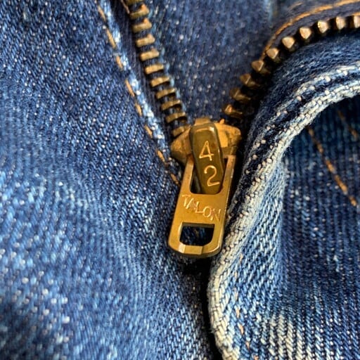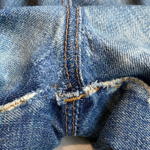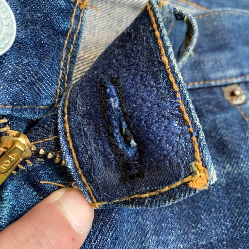 60年代から70年代頃のLEVI'S 502デニムパンツです。1954年頃にジッパーフライ仕様の501ZXXが発売され、1964年頃からXX表記が廃止されることとなり以降501ZXXから502へと品番が変更されました。トップボタンシルバー、42TALON、刻印4、平行ステッチ、ウォッチポケット裏チェーン、バックポケット裏シングル、赤タブBig E、不均等V、セルヴィッジ裏両面シングル。素晴らしく濃淡のついた色落ちで、しっかりとヒゲも入りペンキ汚れも相まって非常に面の良い1本です。ボタンホールと股にリペアを施しています。右側のベルトループが少し弱っています。左バックポケット付け根に小さなダメージがございます。バックポケット下にややヤケが見られます。膝裏にはハチノスも入ります。同じジッパー仕様の505に比べ製造期間も短かったことから玉数も少なく、今回ご紹介したような極上の色落ちした個体は大変希少です。ウエストはW38。ゆったりとしたストレートでこのシルエットがお好きな方も多いかと思います。サイズが合う方は是非いかがでしょうか。