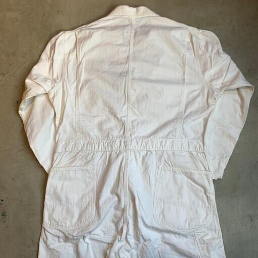 50年代から60年代頃のHERCULES NATION ALLS HBT オールインワンです。HERCULESはアメリカ3大ストアで知られるSearsがワークウェアを展開していたプライベートブランドです。ヘリンボーンツイル地のこちらは、刺繍等が入らないプレーンタイプで、胸元にプリントタグとウエストにベルトストラップが付きます。ジッパーはCONMARのカムロック。先染めなどのコストを抑えることで、価格も安く提供出来た為このような無染色なホワイトワークウェアが製造されたとされています(メモリアルジャケット等もインディゴデニム等に比べ安価で手に入りやすかったからだそうです)。ホワイトボディとしては汚れも少なくダメージも特にございません。左袖にうっすらとシミがございますが、漬け置きなどで目立たなくなると思います。サイズは44Lで実寸もW44。ホワイトボディでここまで綺麗な個体はなかなか出ないと思います。HERCULESでお探しだった方は是非この機会にお買い求めください。デニムカバーオールとも相性抜群です。