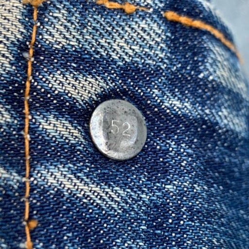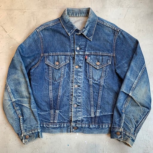 60年代後半から70年代初頭頃のLEVI'S70505-0317ブランケットライナーデニムジャケットです。いわゆる4thタイプのブランケット付きモデルですが、綺麗に取り除かれています。赤タブBig E、不均等V、刻印52、フラップ裏は共地、バータックは紺色、ステッチは1本ラインです。襟にリペア、ステッチ飛び、袖口に擦れダメージがございます。色残りは7割ほどでしょうか、濃淡のある色落ちが良い塩梅です。タグが無い為正確なサイズは不明ですが、恐らく42~44位。ブランケットが取り除かれている為その分肩周りや身幅に余裕を感じます。デニムジャケットの完成形といえる70505はシルエットも綺麗なので1着あると重宝しますので、お勧めです。