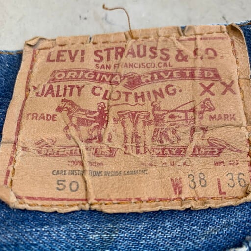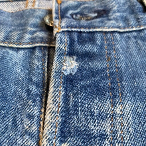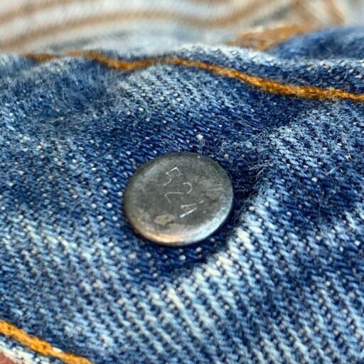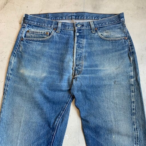 80年代のLevi's501赤耳モデルです。66後期以降でセルヴィッジが使われた最後のモデルで、以前はレギュラー扱いされていることが多かったですが、最近では立派なヴィンテージとして人気も高くなってきています。刻印524、縮率10%、閂ブラック、赤耳。ムラ感のある色落ちで裾付近のブリーチが良い雰囲気な1本です。フロントトップボタン下に小さなダメージがありますが特に致命的なものではないので気にならない範疇かと思います。表記はW38ですが、実寸はW36。66モデル以前のモデルに比べ価格帯もまだ手頃なので、気軽に穿けるライトヴィンテージとして重宝します。