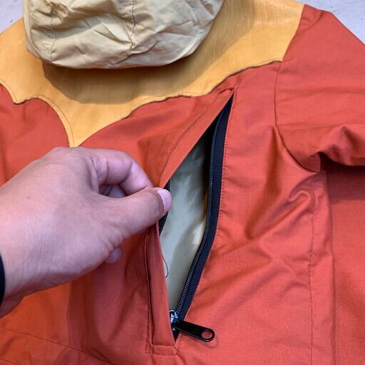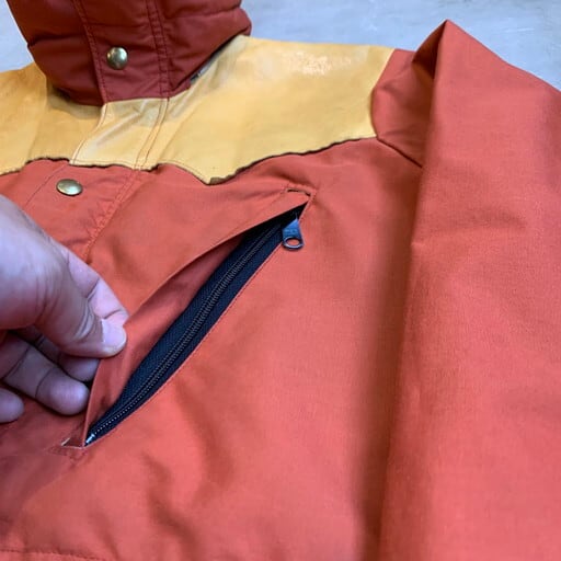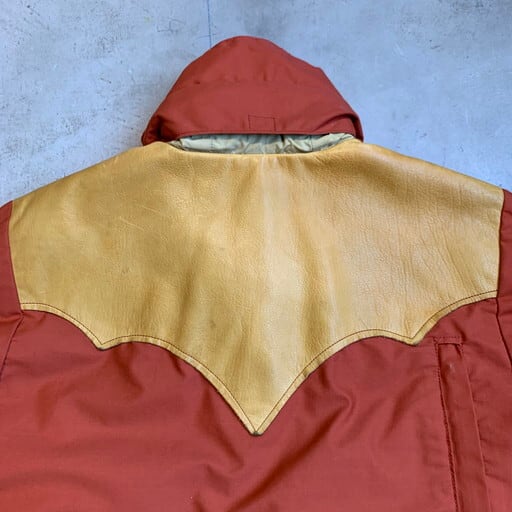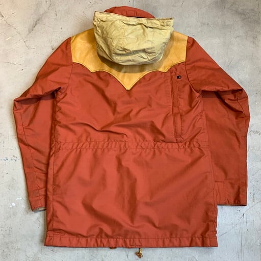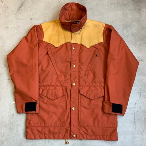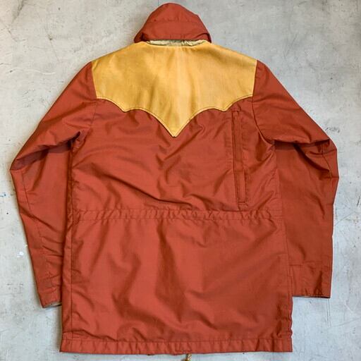 70年代頃のROCKY MOUNTAIN FEATHERBED ゴアテックスマウンテンパーカーです。1960年後半にワイオミング州ジャクソンホールで創業されたカウボーイ向けのダウンウエアブランド。1974年にGORE-TEXを採用したマウンテンパーカーが製造され、こちらはその当事のオリジナルアイテムです。継ぎ目の無い1枚のレザーヨークにオレンジのシェルカラー、TALONのダブルジッパー、マップポケット。高さのあるスタンドカラーには折りたたみ式のフードがマジックテープで収納されています。内側の下部にらーなーの破れが見られますが、その他は比較的美品です。サイズ表記はございませんが170cm70kgのスタッフで、身幅と肩幅がややタイトに感じます。着丈はちょうど良いです。恐らくメンズのS~M相当です。アウトドアウェアでは人気の高いオレンジカラーですので、サイズの合う方は是非この機会にお買い求め下さい。