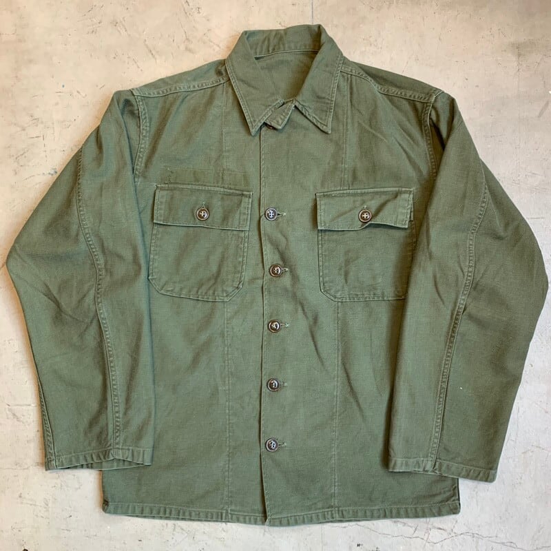 50's U.S.ARMY OG107 コットンサテンユーティリティーシャツ 1st 初期 プレーン 筒袖 オリーブ SMALL 米軍 ミリタリー 希少 ヴィンテージ BA-1778 RM1547H