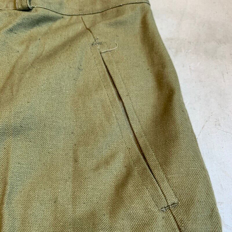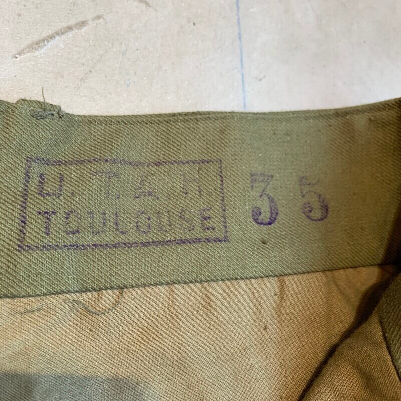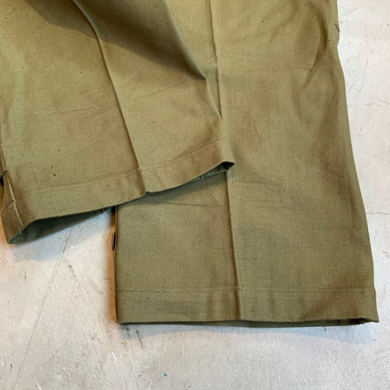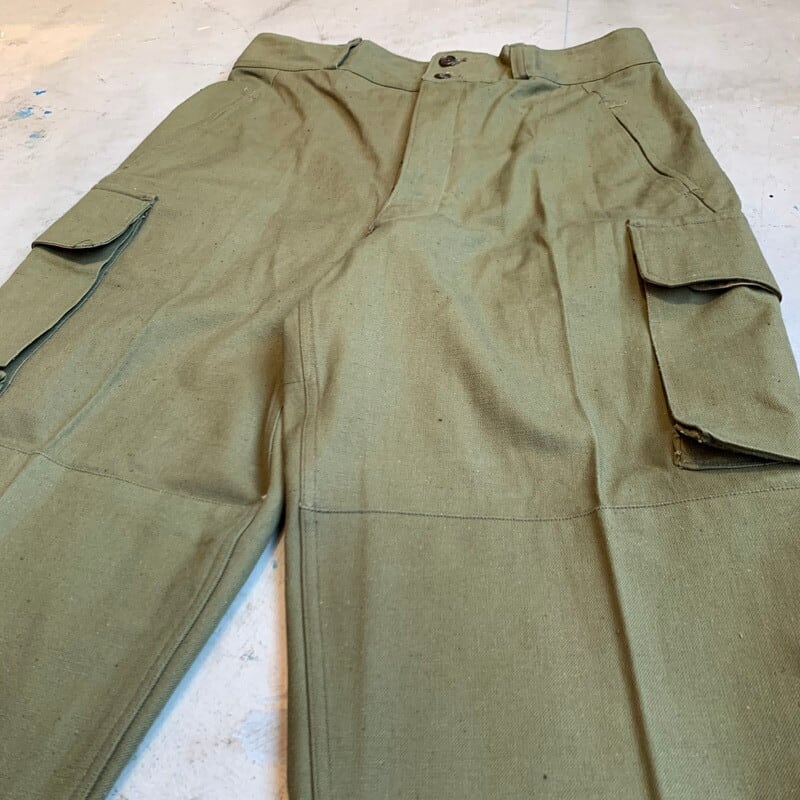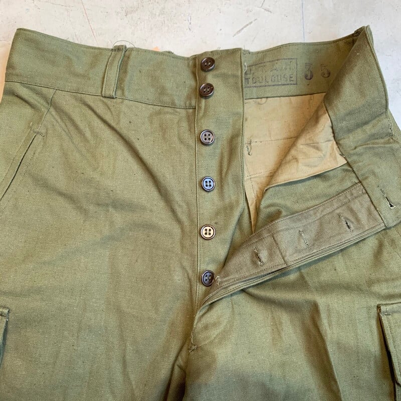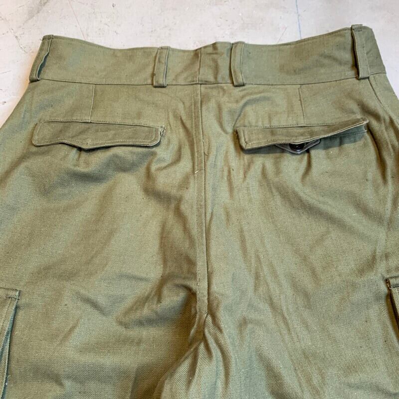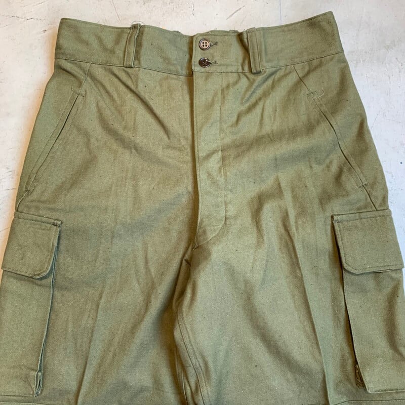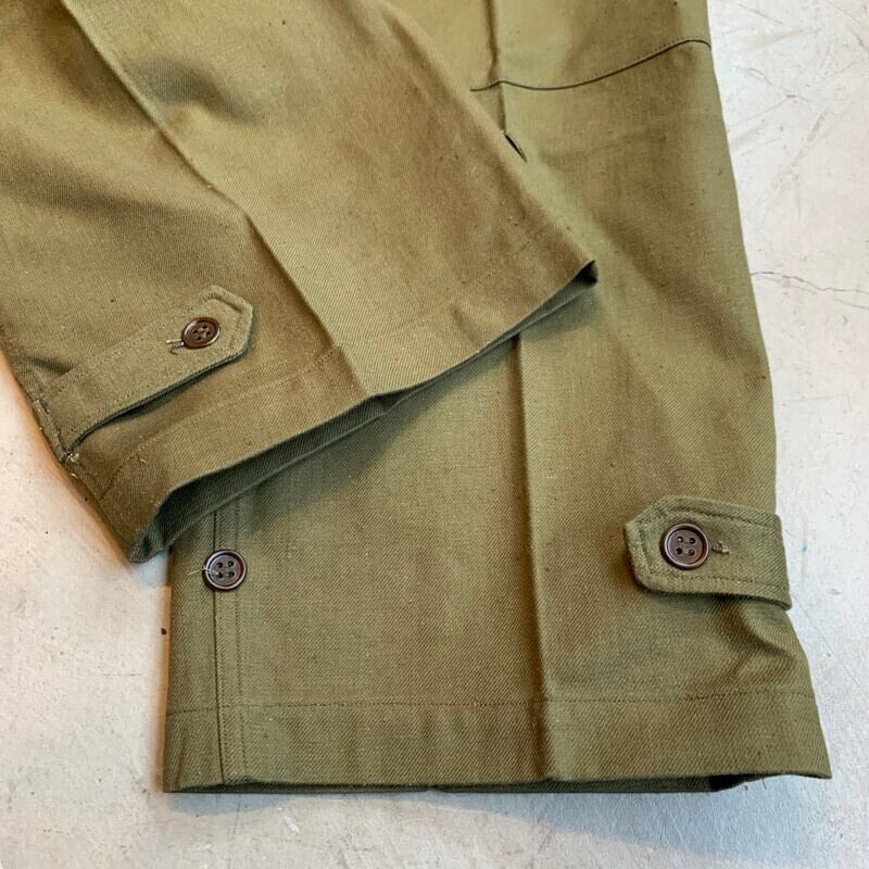40年代から50年代頃のフランス軍M-47フィールドパンツです。張りのあるコットンボディが使用されており前期型と呼ばれています。マルジェラがサンプリングした事で有名なフレンチミリタリーの名作です。フロントは6つのボタンフライ、サイドポケットは2段階調整できる仕様です。モーターサイクルパンツ同様に裾は、ばたつかないように絞れる仕組みです。畳みジワはございますが、使用感のほとんどないほぼデッドストックのようなミントコンディションです。ウエストはW36位でストレートシルエットが魅力的な1本です。人気が高く入荷後すぐに売り切れるマストバイなアイテムです。