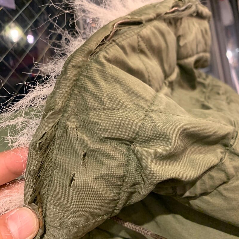70年代から80年代のPARKA EXTREME COLD WEATHER フィッシュテールパーカーです。ボディーは73年のWYNN社、フードは82年のFAISON社。フードファーはコヨーテからアクリルファーに替わり、ワイヤーで形状を維持できます。フロントはブラスジッパーを使用しています。フードにワイヤーで敗れた箇所やダメージがみられます。ボディーのフロントに小穴がございます。ライナーは欠損しています。サイズはMEDIUMです。昨今の人気で市場でも枯渇していますので、お探しだった方は是非いかがでしょうか。