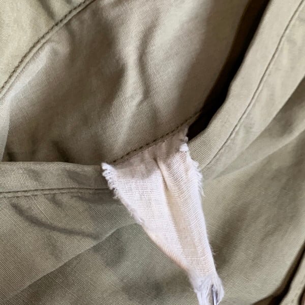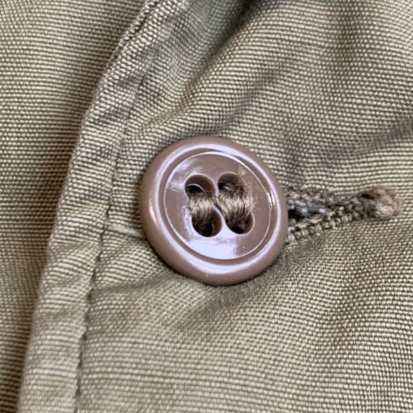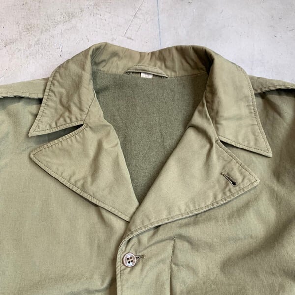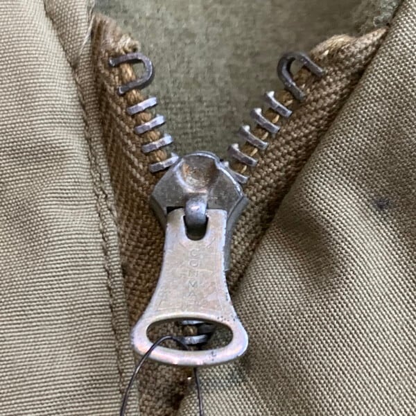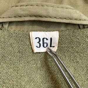 40年代頃のM-41フィールドジャケットです。陸海空のそれぞれの部隊でも使用され、フィールドジャケットの元祖として知られるモデルです。ライニングにはウールが使われています。硫黄島で旗を掲げた戦士が着用していたのもM-41フィールドジャケットと同TYPEと言われています。フロントは6つのボタンと、CONMAR社でコの字留めのピンロックジッパーが採用されています。ボディカラーカーキとなります。襟下にはチンストラップが付いていますので、襟を立てて固定できます。サイズは36Lとやや着丈の長いタイプですので、合わせやすいサイズ感だと思います。M-41フィールドジャケットはダメージや汚れが目立つ物は市場でも見かけますが、こちらは一部うっすらとシミが見られる以外はダメージなどほとんどないミントコンディションです。コレクションピースとしても貴重なアイテムです。
