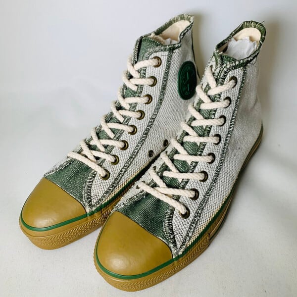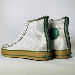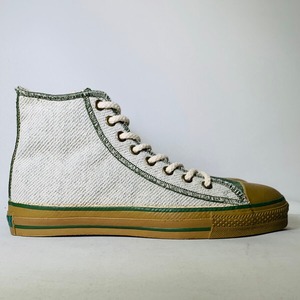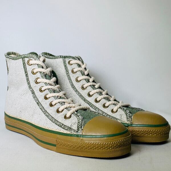90年代のコンバースオールスターハイ INSIDE OUT デッドストックです。生地の裏返しを意味する「INSIDE OUT」のモデル名どおり通常裏地となる面がアッパーに使用された斬新なデザインが特徴な1足。ネイビーのモデルもございますが、こちらの配色ではつま先とサイドテープがカーキ色となっており、クラシックな印象です。シューレースは平紐では無くボリュームのある編み紐です。ホワイトと生成りの2色付属しており、画像は生成りを実装しています。ネイビーモデルに比べこちらのカーキはほとんど市場でも見かけないので珍しい配色ではないでしょうか。紙タグは欠損していますが、デッドストックです。サイズはUS8のゴールデン。今では希少なUSA製です。ミリタリーなどお好きな方にもおすすめです。