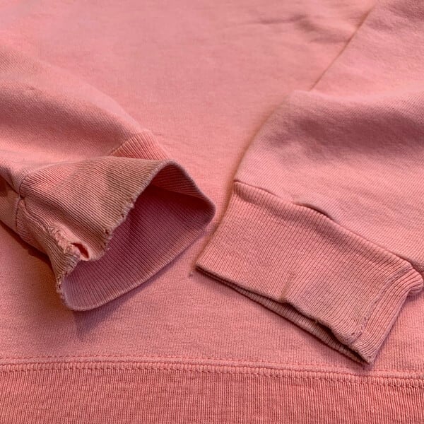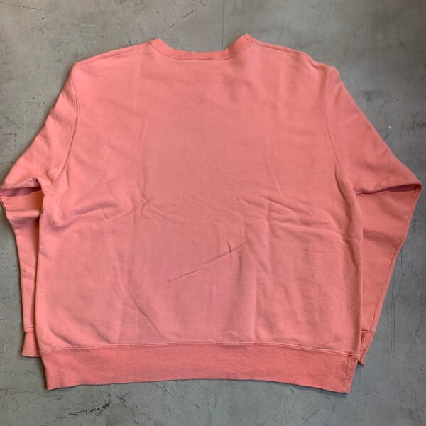 90年代のChampionロゴスウェットです。こちらはリバースウィーブでは無いタイプのスウェットで、セットインスリーブに前V(ガゼット)が付くヴィンテージのスウェットを彷彿させるデザインで、胸元にはロゴが刺繍で施されています。淡いサーモンピンクのボディは他の濃い色の物に比べると少し珍しいのでは無いでしょうか。裾リブの裏にネームをマジックで消した様な箇所がございます。その他ダメージなど無く良好です。サイズはXLで、身幅が広く着丈ゆったりとしていますが、着丈は長すぎないので一番旬なサイズ感だと思います。リバースウィーブのほうが圧倒的に人気はありますが、こちらのタイプもお好きな方は多いのではないでしょうか。