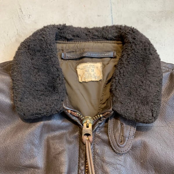 70年代のU.S.NAVY G-1レザーフライトジャケットです。DSA100-75-C-0332。75年コントラクトの白タグが付きます。人気のBRILL BROS社製となります。ボディはダークブラウンのゴートスキンで、ムラのあるシボ感が良い表情をしています。ブラスの大き目なYKKジッパー使用。前立て内側にはUSNのパンチングがございます。リブに小さな虫食いは見られ、袖等に擦れや小さなダメージがございます。革の硬化はございませんが、襟ボアのムートンがやや潰れて毛が寝ています。内側ライニングにリペアがございます。サイズは38。大き目に着用するアイテムではないと思うのでジャストで着るには良いサイズ感ではないでしょうか。おすすめです。
