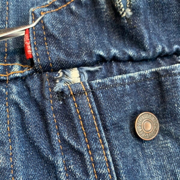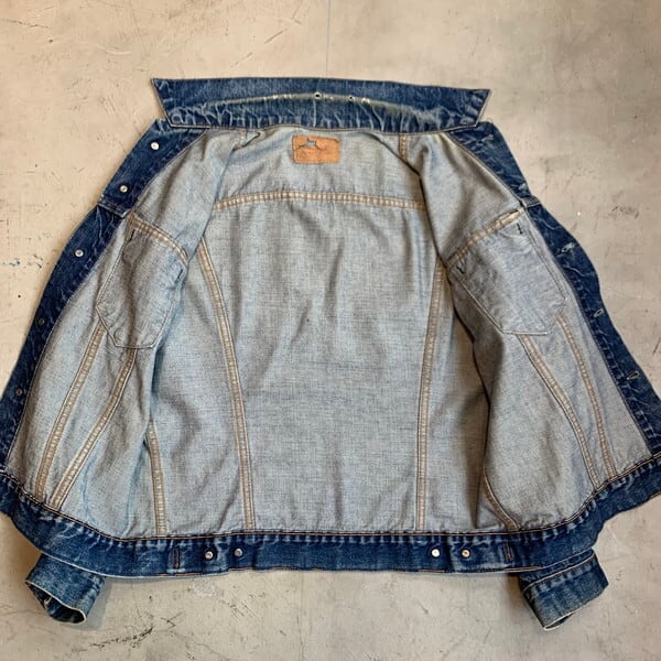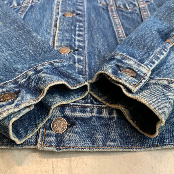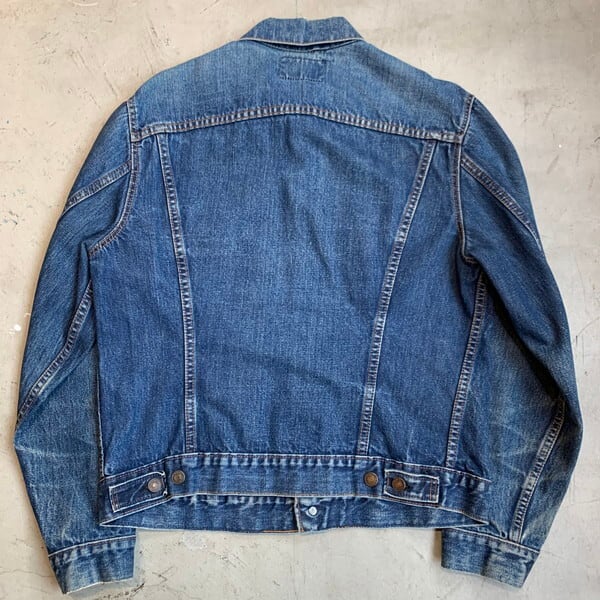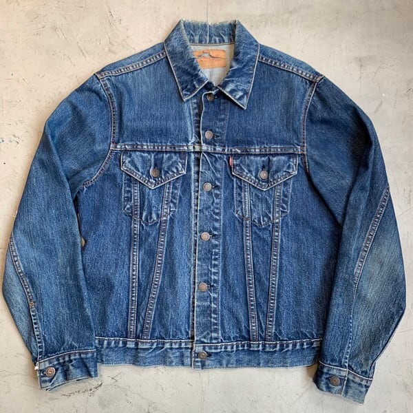 60年代後半から70年代初頭のLEVI'S70505デニムトラッカージャケットです。ケアタグの付く最終後期頃のモデルと思われます。小紙パッチ、ケアタグ(欠損)、刻印52、不均等V、Big E、ポケット裏シングル、閂ブラック。所謂4thと呼ばれるリーバイスのデニムジャケットの集大成といえる完成されたデザインが人気の1着です。557の3rdに比べ着丈も長いのでファッション性も高く様々なスタイリングに使える優れものです。色残りは6割ほどでこれからがっつり着込めばさらに濃淡のついたエイジングが楽しめそうです。小パッチの印字は消えていますが、おそらく40~42位です。襟と袖口に擦れによるダメージはございますが、良いサイズ感ですので、サイズでお探しだった方は必見です。