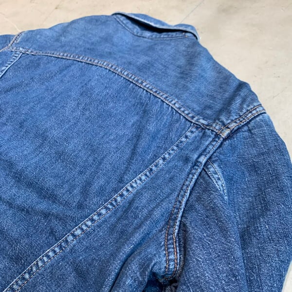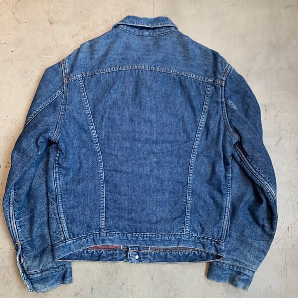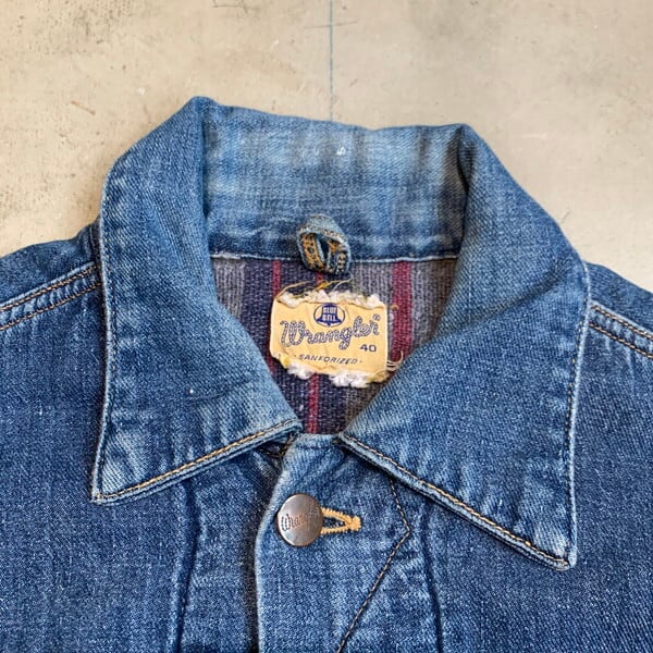 60年代のWrangler 8MJLブランケットデニムジャケットです。11MJのブランケットライナー付きタイプで、888MJLの後継ともいわれています。11MJなどに比べライトオンスのデニムが使用されておりライニング付き特有のごわつきはあまり感じません。60年代初頭に約2年間しか製造されていない希少種です。フロントは3つポケット、前立て裏にはセルビッジが使われており、ライニングのブランケットにはダメージもみられません。タグは縦ベルにサイドサイズ表記。背面肩周りにはアクションプリーツ無し。襟もとと袖口にやや擦れやダメージが見られますが、その他は良好です。サイズは40ですが、着用感は38位。WRANGLERの歴史の中でも製造年数も極めて短くなかなか市場では見かけることの少ないモデルです。サイズの合う方や、ラングラーフリークの方は是非いかがでしょうか。