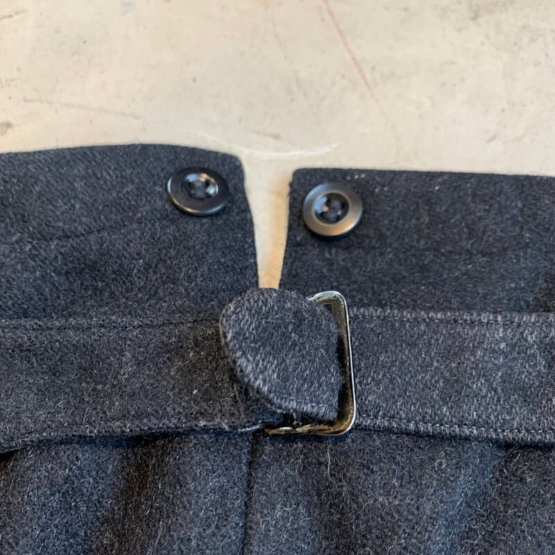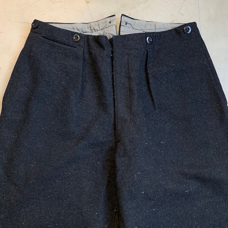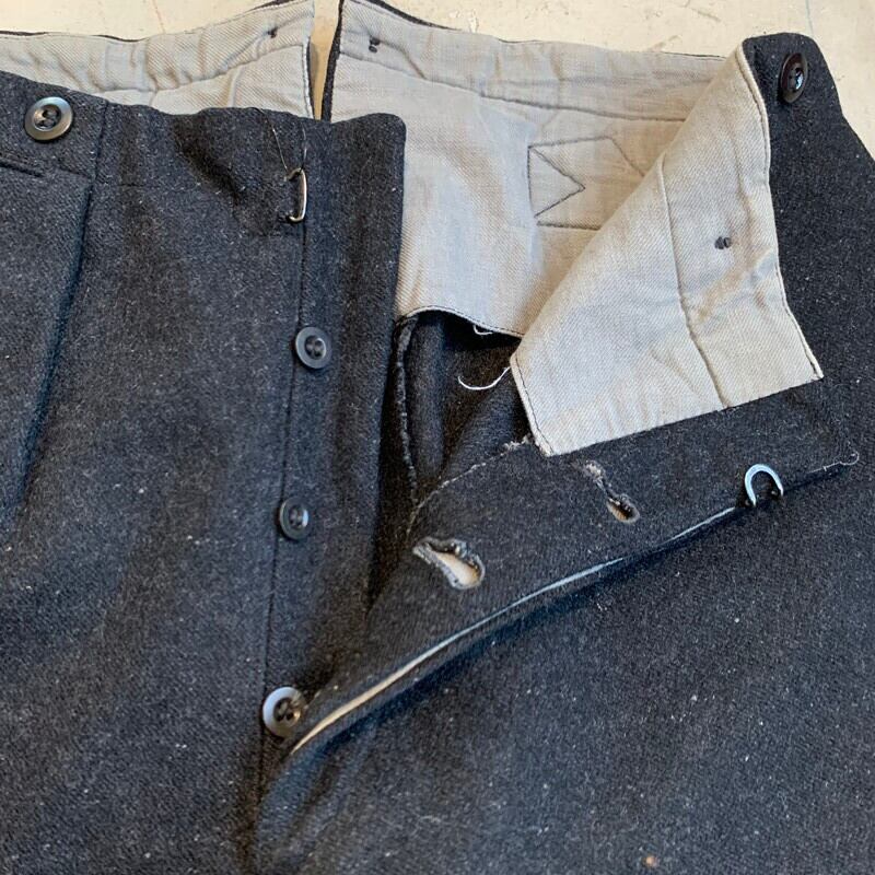 30年代頃のウールネップワークパンツです。ネップの入るしっかりとしたウールが使われており、おそらくフランス等ヨーロッパメイドと思われます。股は動きやすいようクロッチガゼット仕様となっていますので、ワークパンツとして使われていたのかもしれません。フロントにはタックが入り、ベルトループは無くサスペンダーボタンと針刺しのシンチバックがございます。スラッシュポケットもアウトシームに沿った縦型の古いディティールで、ウォッチポケットとバックポケットは両玉縁で仕上げられています。裾裏には踵擦れ防止のレザーが縫い付けられています。お尻部分にタタキと1か所生地にダメージがございますが、肉眼で見てもほとんど目立ちません。か全体的にかなりコンディションは良いといえる個体です。80年程昔のアイテムながら古臭さも無く、シルエットはゆったりとした腿周りから裾に向かって緩やかにテーパードしており、現代風の着こなしも出来る素晴らしいデザインです。ブラックカラーなのでスタイルを選ばずコーディネート出来ますので、これからの季節に大変お勧めな1本です。