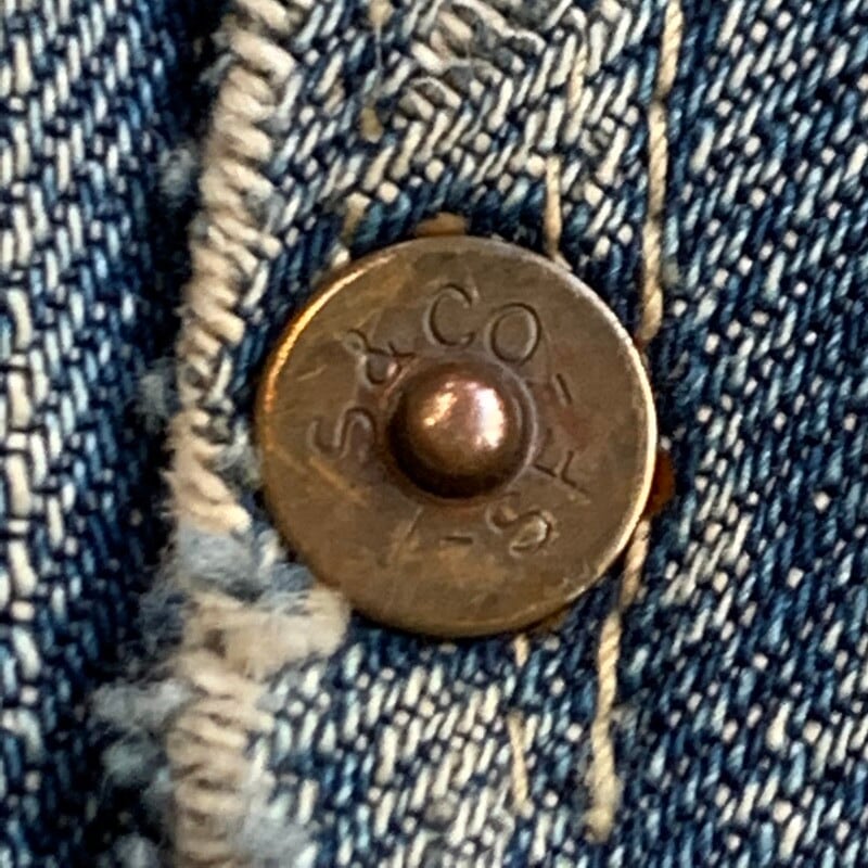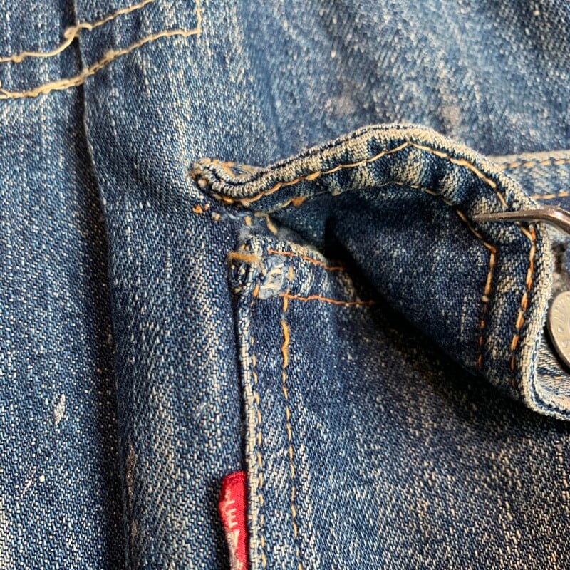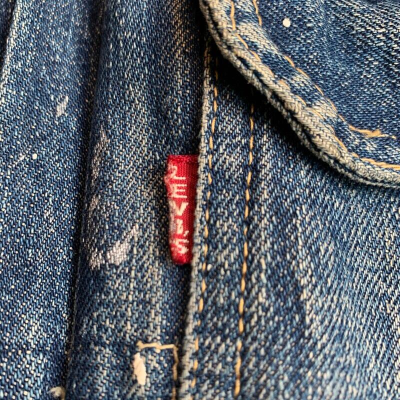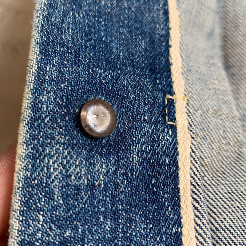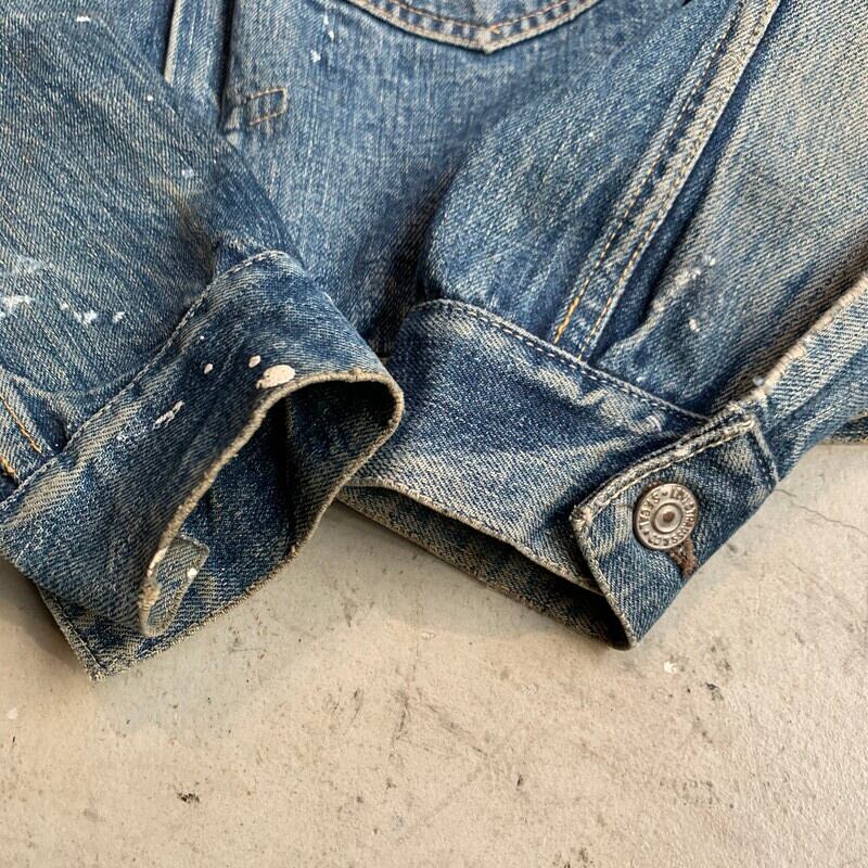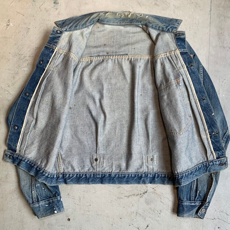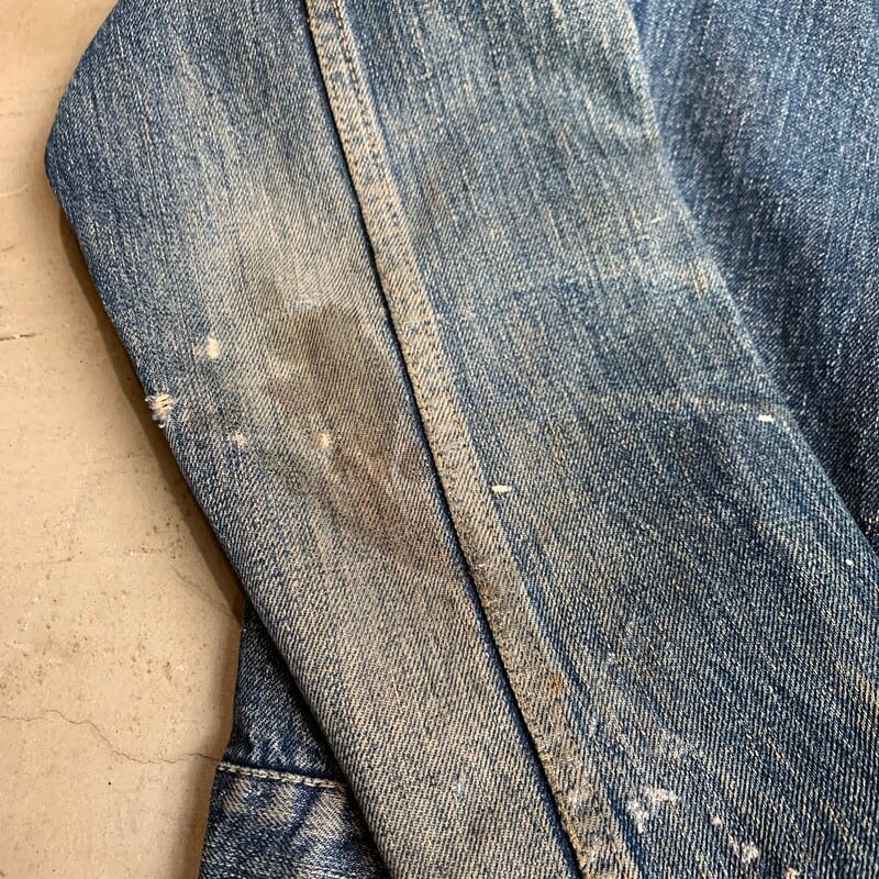 40~50年代の506XXデニムジャケット、通称1st(ファースト)です。こちらは、シンチバックが針無しで、リベットは文字が中央に寄っています。ボタン裏は2プロング刻印無し、フロントボタン5つ、平行ボックスステッチ、ポケットフラップ有り、片面赤タブ、等から戦後の1947~1953年あたりのモデルと思われます。襟もとにダメージが有り、ボックスプリーツのステッチが切れています。胸ポケットのリベットが片方紛失しています。全体にペンキが飛んだり薄汚れ等ございますが、雰囲気も良く歴史を感じる色落ちがたまらない1着です。