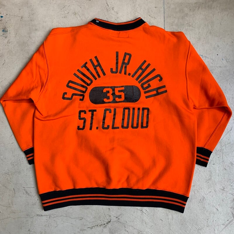 50年代から60年代頃のRussell Southernナイロンレーヨンシャツです。ラッセルの中でも古い黒タグが付くアスレチックウェアです。オレンジブラックの2トーンで、リブにはラインが入ります。袖の長さは7分袖で珍しいデザインです。60年代初頭頃のadidasでワールドマークが入る似たデザインのウェアがあったようなので当時良く作られていたデザインなのかも知れません。バックに3段ラバープリントが入ります。フロントにうっすらとシミや白っぽい箇所は見られますがダメージ等無くとても状態の良い個体です。サイズはL。黒タグ自体なかなか出ないですが、この7分袖タイプも市場ではほとんど見かけませんので、サイズが合う方は是非いかがでしょうか。