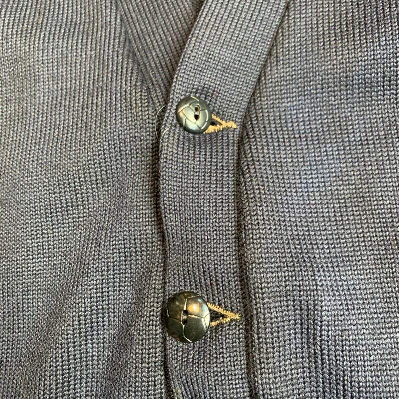40年代から50年代頃のDehenローゲージニットカーディガンです。ワッペンが施されたレタードカーディガンと違いプレーンタイプのシンプルな1着です。左袖に3本のラインが入ります。フロントのポケット裏はイエローとなっており、ちらっと見える具合が良いアクセントとなっています。一番上のボタンが付け替えられており、第3、第4ボタンの間にシミがございます。その他虫食い等無く綺麗です。サイズ表記はございませんが38位と思われます。シンプルなので、何にでも合わせやすいですし、ワッペンでカスタムしても良いと思います。1枚あると重宝するアイテムです。