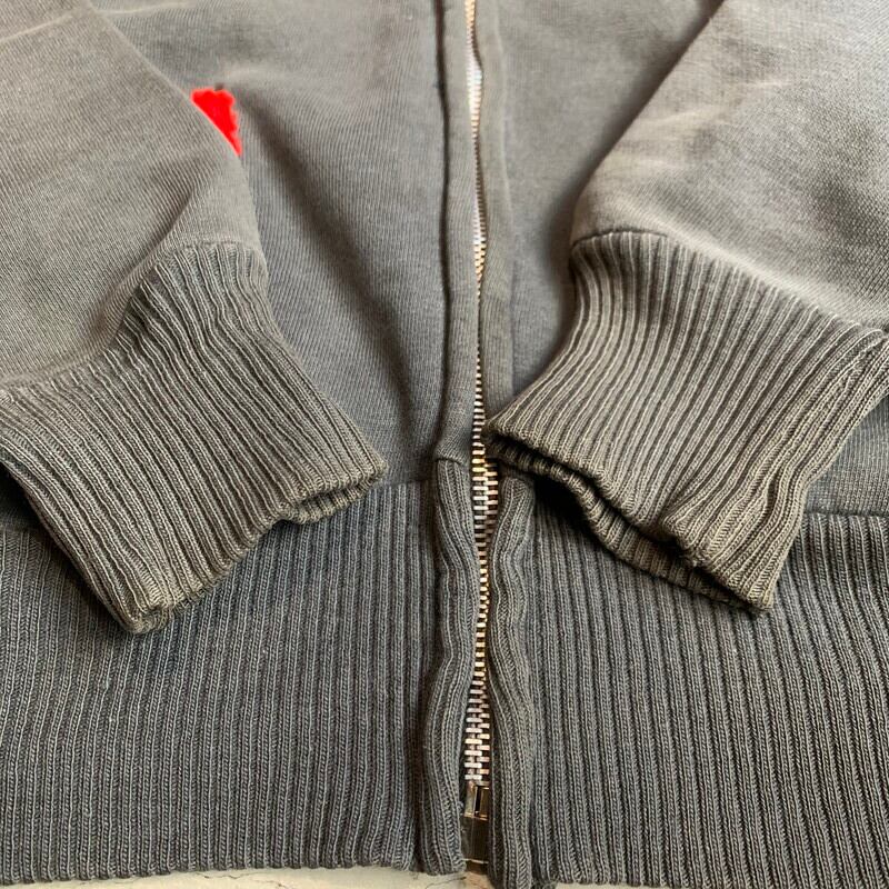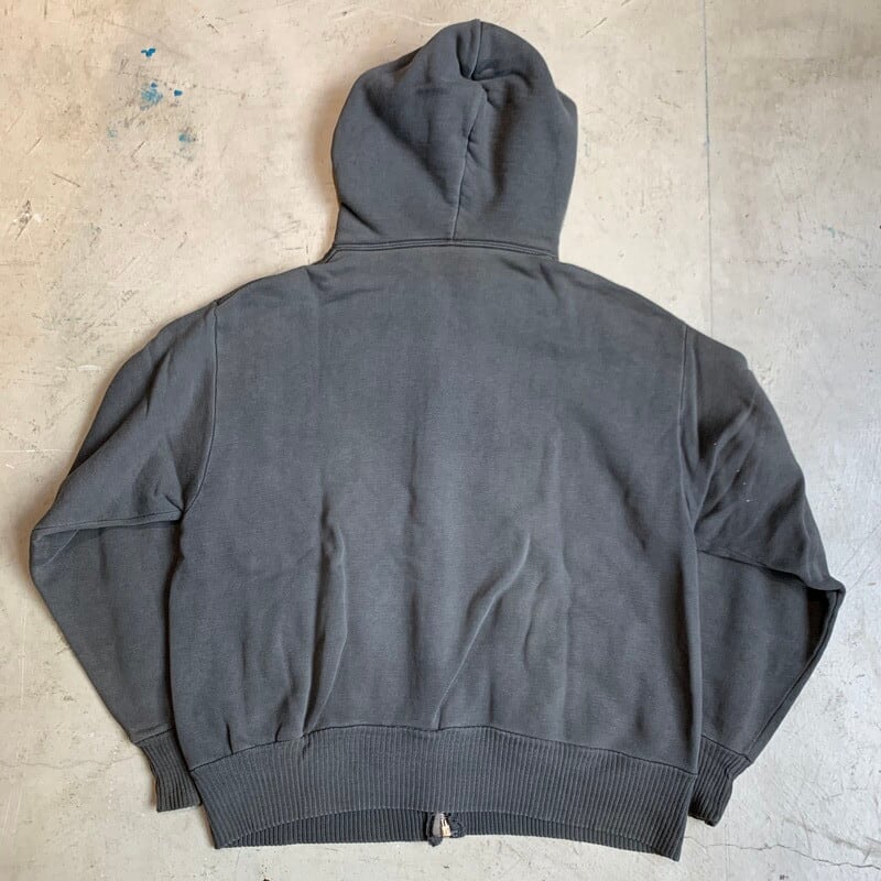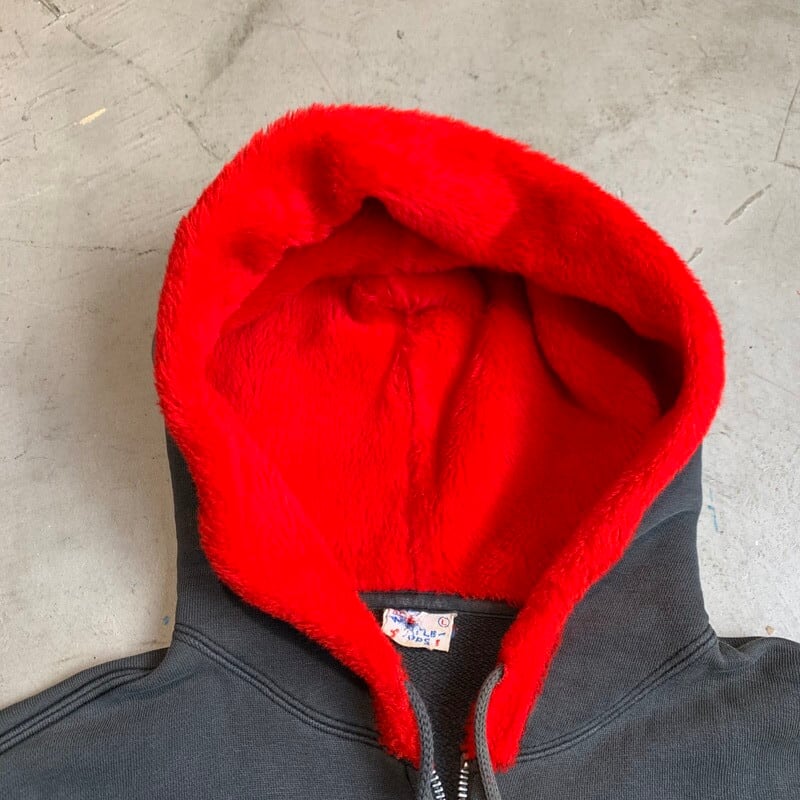 50年代頃のAKOM WHISTLE TOPS ジップアップパーカーです。WHISTLE TOPSはAKOMのボーイズラインです。フロントはLAMARのアルミピンロックジッパーにセパポケ。注目すべきはやはり、フードとポケット淵の赤いボアです。こちらは後付けのカスタムでは無く当時のオリジナルの仕様で非常に珍しいアイテムです。ボディは雰囲気のある墨黒で赤いボアが非常に映える1着です。また、リブは針抜きとヴィンテージラヴァーには溜まらないディティールです。使用感や色褪せがあり、ジッパー裏のリブに少しダメージはございますが着用に問題はなさそうです。ボーイズのL表記ですが、身幅もしっかりあり、成人男性のS~Mといったサイズ感です。ジャストめに着用される方や女性にも良いサイズです。Lightningが発行したヴィンテージスウェットシャツの本にこちらの色違いが掲載されています。AKOMのパーカーの中でもかなりの変わり種だと思いますので、コレクションとしても楽しめる希少なアイテムです。