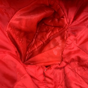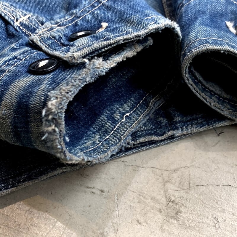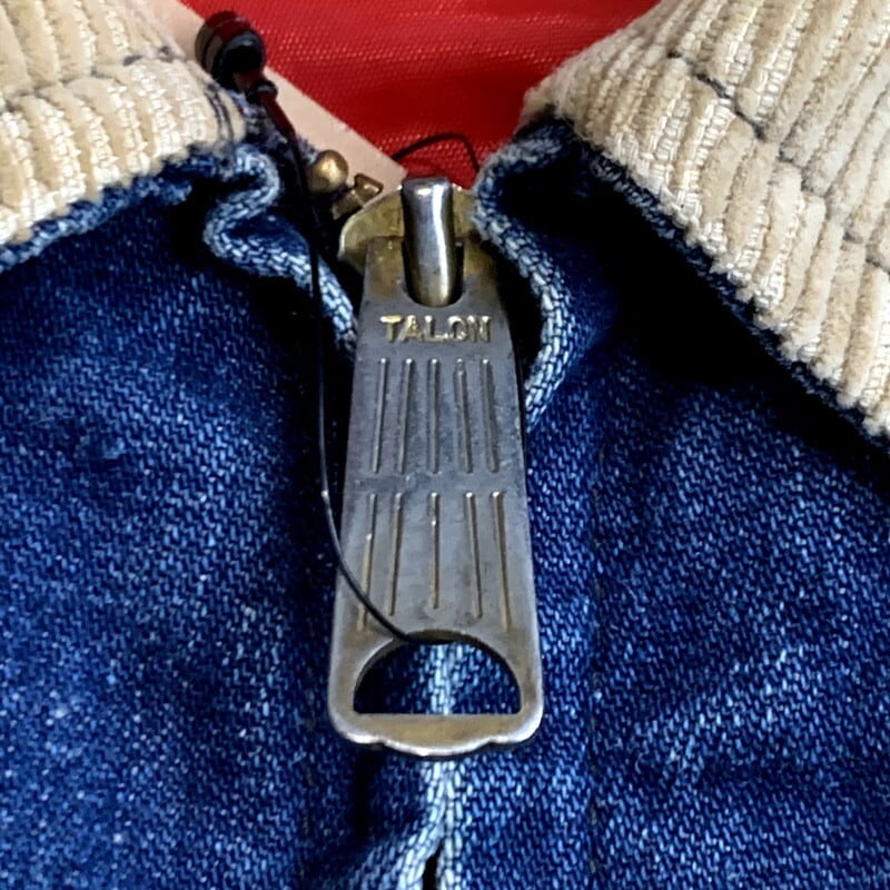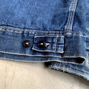 70年代頃のLee191-LBデニムワークジャケットです。Leeのワークジャケットで初めてジッパーが採用されたとされる91-Bのキルティングライナーが付くモデルです。首タグはプリントタグで、ピスネーム共に® MRが入ります。フロントは大きなもち手のTALON、胸元は涙TALONと呼ばれるジッパーが採用されています。袖口とサイドのアジャストボタンは全て猫目ボタン。両袖はハードなハチノスが入るほど色落ちしており、ブリーチやインク染みなどございます。両袖口は擦れによるダメージが見られます。フロントポケット下に大きなインク染みが見られたので、古いワッペンでカスタムしております。(ハンドステッチなので、不要であれば簡単に取れます)。ライナーのアームホール付近にハンドステッチでのリペアも見られます。サイドのアジャスターボタンが1個欠損しています。サイズ表記はございませんが、44位のゆったり目です。このあたりの年代のアイテムも最近では価格も上がりつつありますので、サイズが合う方は是非いかがでしょうか。