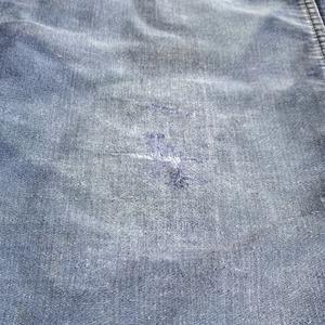 40年代から50年代辺りの物と思われる、Jeanot Lou PAYSANモールスキンワークパンツです。フランス語表記なので、恐らくフランスメイドでは無いでしょうか。全体にフェードしており所々に擦れやダメージを補修したリペアが見られます。ポケット淵やポケット内側に補修されていないダメージも見られます。にヴィンテージのユーロワーク物でも良く見られるハンドステッチによるリペアが良い雰囲気です。ウエストはW36インチ相当です。ややゆったりとしたサイズですので、サスペンダーで合わせてみてもかっこいいと思います。年々ユーロのモールスキンアイテムは価格も高騰していますので、サイズの合う方は是非この機会にいかがでしょうか。