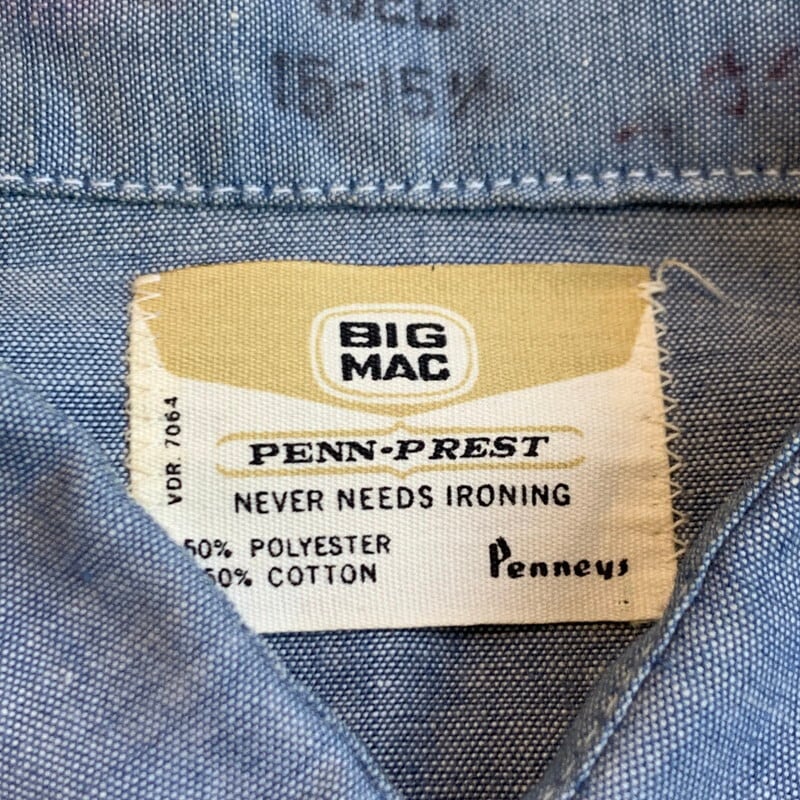 ~70's BIG MAC PENN-PREST シャンブレーシャツ ワークシャツ Pennys ストアブランド 襟芯なし L位 希少 ヴィンテージ BA-1225 RM1594H