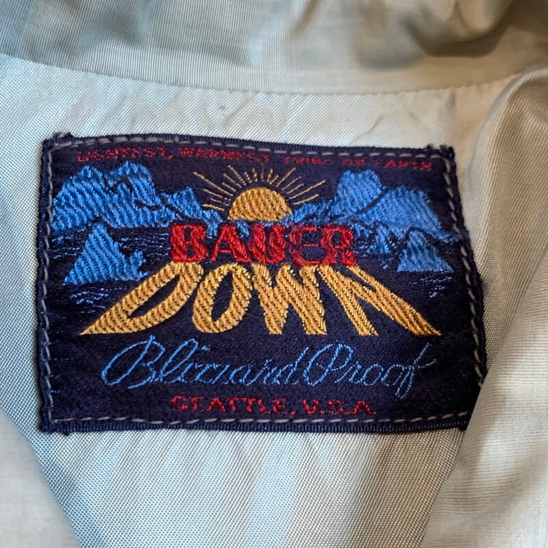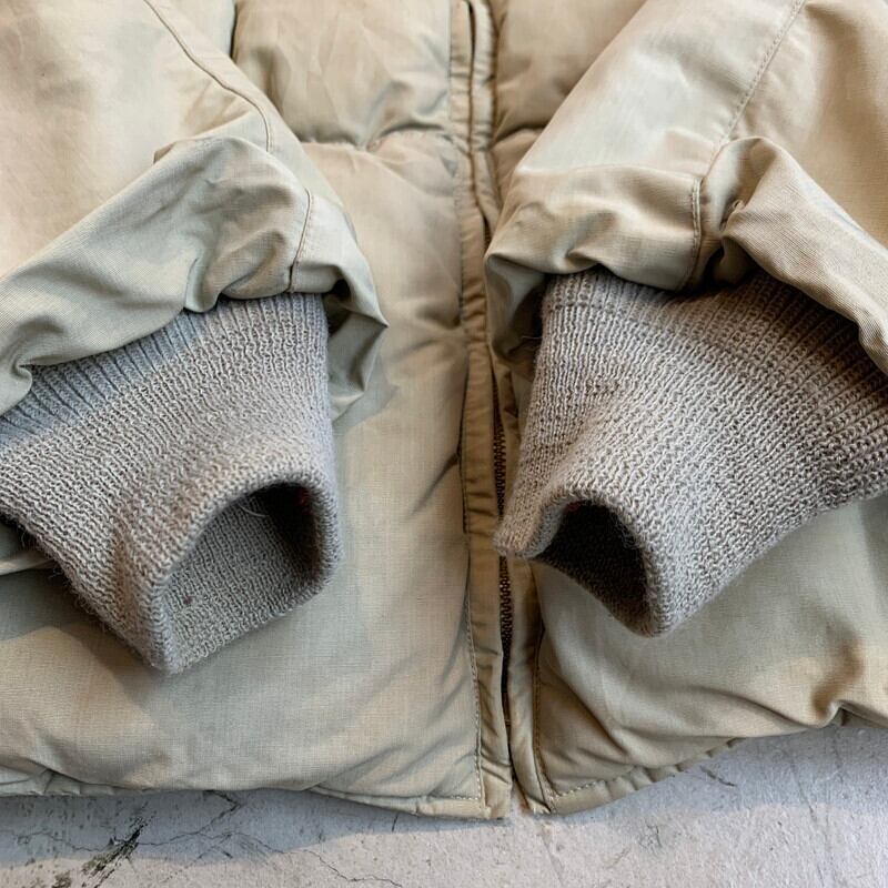 50年代のEddie Bauer BAUER DOWN キルティングダウンジャケットです。®マークの付かない日の出タグの初期頃の物ですが、モデル名は不明です。スカイライナーのようでもありますがキルティングのステッチの角度が違います。袖内側とハンドウォーマーポケット内側に赤いボアが使用されています。羽根抜けはほとんど見られませんが、スカイライナー等と比べると若干ダウンのボリュームは控えめに感じます。襟やボディにシミが見られます。リブに虫食いはございません。使用感はございますが、大きなダメージはございません。サイズ表記が無いですが、M相当。着丈は短めなのでジャスト丈がお好きな方にお勧めな1着です。希少な初期の日の出タグが付くモデルですので、お探しだった方は是非いかがでしょうか。