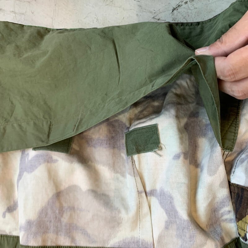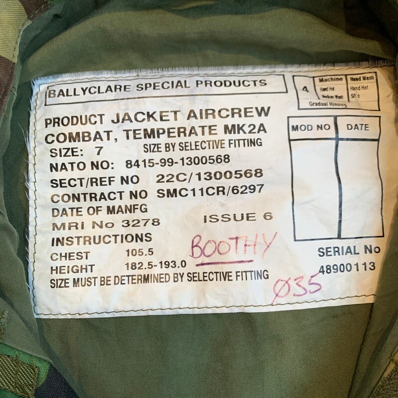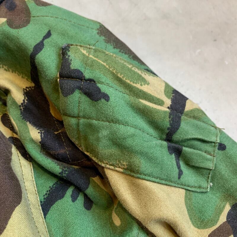90年代から2000年代の物と思われる、イギリス軍 RAF MK2A エアクルーコンバットジャケットです。Disruptive Pattern Materialと呼ばれる迷彩柄が使用されており、イギリスの空軍で使われていたアイテムです。胸元の斜めに配置されたジッパーポケットや、パラシュートボタン、肘の角度に沿って湾曲した縫製など、エアクルーならではのディティールです。使用感は少ない美品ですが、背面のフラップ内部に収納されるフードが切り取られています。サイズは7で、ハーフコートのような感覚で合わせていただけます。イギリス軍の中でも人気のRAFのアイテムですので、サイズが合う方は是非いかがでしょうか。