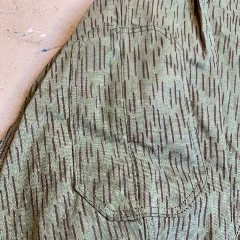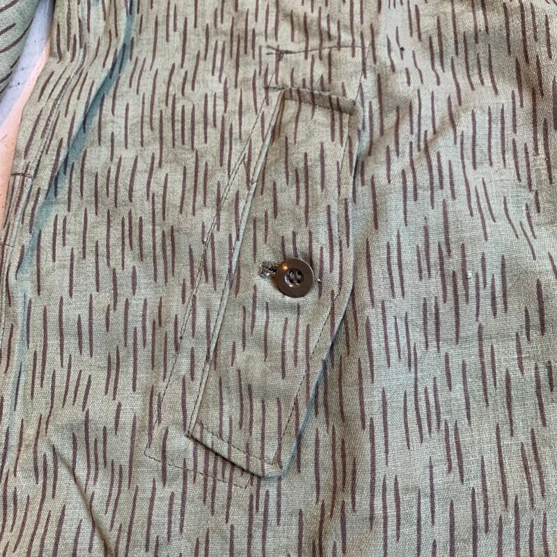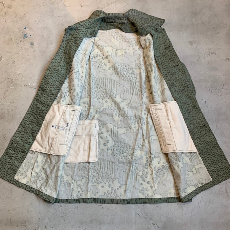 60年代のチェコ軍M-60 レインドロップカモコートです。ニードルカモとも呼ばれる雨を模した迷彩柄で、東ドイツ軍にも酷似した迷彩がございます。このチェコ軍が採用したレインドロップカモは、レオパードのような柄の上からプリントされているので、柄に奥行きがあり独特な表情が人気です。内側のスタンプから1965年コントラクトと思われます。裏地の一部にうっすらと汚れはございますが、使用感はほとんど無く、恐らくデッドストック品を保管していた物と思われます。サイズ表記は2Bで、170cm70kgのスタッフで肩幅や身幅はちょうど良いサイズ感。袖はやや長めなので、軽くロールアップすると良いです。シルエットはとても綺麗なので、柄物ですが非常に合わせやすいアイテムです。ユーロミリタリーアイテムがお好きな方は是非いかがでしょうか。バックポケットが良いアクセントとなっています。