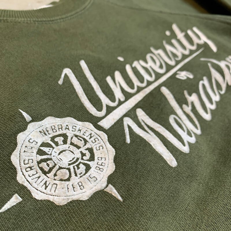 60's CHAMPION チャンピオン ラグランスリーブスウェット University of Nebraska フロッキープリント ランタグ インC カーキ オリーブ グッドコンディション LARGE 42-44 USA製 希少 ヴィンテージ BA-1235 RM1604H