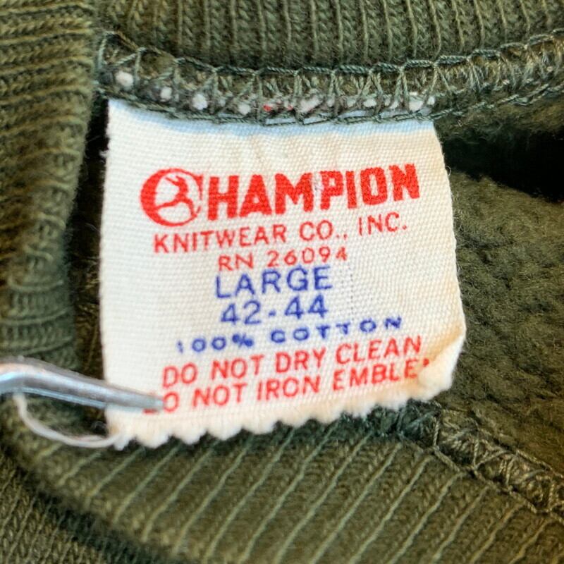60年代頃のChampionラグランスウェットです。インCと呼ばれるランタグが付きます。フロントにはUniversity of Nebraskaのフロッキープリントが入ります。襟元2本針、その他は4本針。左袖に小さなダメージがあります。若干のヤケはございますが、かなり綺麗な個体だと思います。表記サイズはLARGE。身幅は広く着丈はやや短めです。タグもダメージは無く、フロッキーもしっかりと残っています。お探しだった方はこの機会に是非いかがでしょうか。