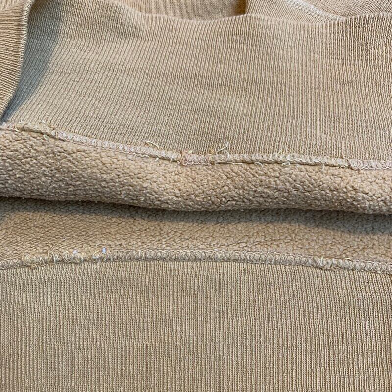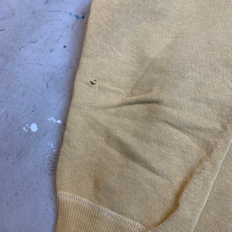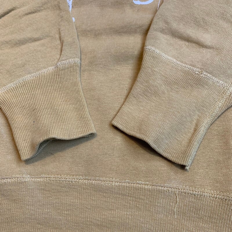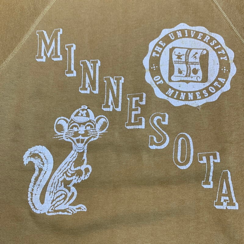 50年代頃のUNKNOWNラグランスウェットです。ミネソタ大学のマスコットキャラクターであるGoldy Gopherがプリントされており、斜めに入るデザインも秀逸な1着。このGoldy Gopherのデザインも1940年代に考案された3代目とされており、1954年には新たなデザインも導入されたようです。Goldyの名前さながらゴールドのようなマスタードカラーのコットンボディが使用されています。フロントや袖等に小穴やダメージが見られ小さなシミ汚れもございますが、致命的なダメージではないので簡単なリペアでカバーできると思います。タグが欠損していますが、サイズはL相当。リブも長めで、ヴィンテージスウェットとしては状態はまずまずです。レッドやネイビー等に比べ球数も少ないと思われるカラーですので、サイズが合う方は是非いかがでしょうか。