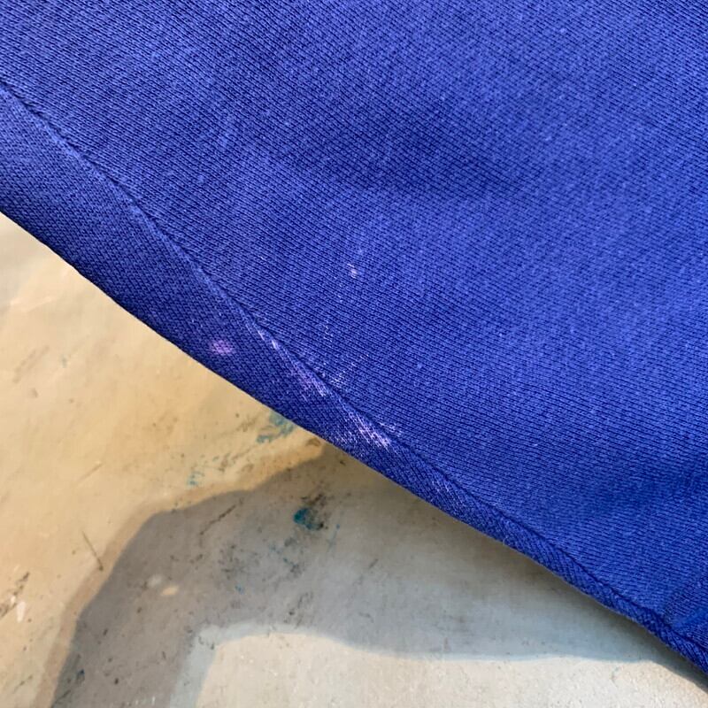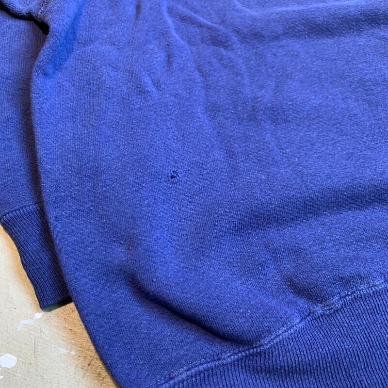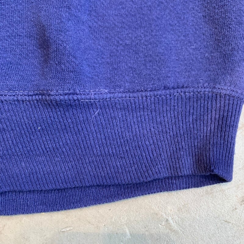 50年代から60年代頃のUNKNOWNラグランスウェットシャツです。ALEXANDER RAMSEYと羊の種類であるビッグホーンがフロッキープリントであしらわれています。ブルーとパープルの中間色のような色味で、サンフェードすると綺麗なナス紺に変化が期待できるカラーです。首元やフロント、肩などにダメージが見られます。両袖に一部ブリーチが見られます。全体に使用感があり色褪せも見られますが、ヴィンテージ特有の良い雰囲気な1着です。サイズ表記等タグはございませんが、身幅が広く着丈がやや短いタイプです。M~L相当。サンフェード等経年変化を楽しめるアイテムですので、お好きな方は是非いかがでしょうか。