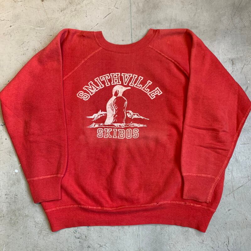50's 60's UNKOWN ラグランスウェットシャツ SMITHVILLE SKIBOS フロッキープリント ペンギン レッド 赤 フェード L位 希少 ヴィンテージ BA-1243 RM1612H