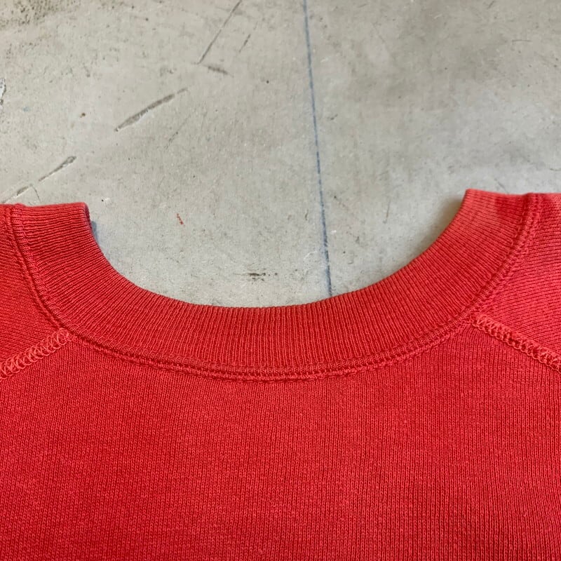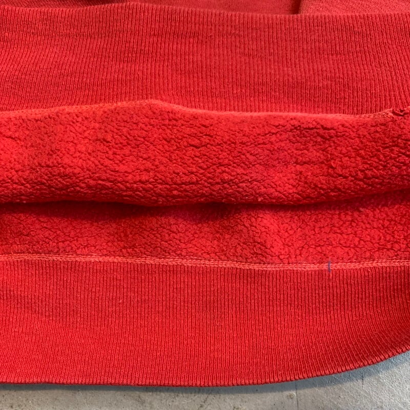 50年代から60年代頃のUNKNOWNラグランスウェットシャツです。インディアナ州にあったSMITHVILLE高校のバスケットボールチーム(通称SKIBOS)のアイテムです。1970年代には廃校になったようで1972年までの年鑑しか見つかりませんでした。プリントはこちらもフロッキーですが、起毛部分はほとんど無くなっています。肩周りや裾リブ付近にダメージがございます。肩やフロントにはサンフェードも見られます。生地はフカフカとしています。身幅が広く着丈は短めですのでレイヤードを楽しんでみてはいかがでしょうか。スチームで幾分か着丈は伸ばせそうです。かなりローカルなカレッジ物ですが、返って見つかりにくいと思いますので、マイナーなアイテムがお好きな方は是非いかがでしょうか。