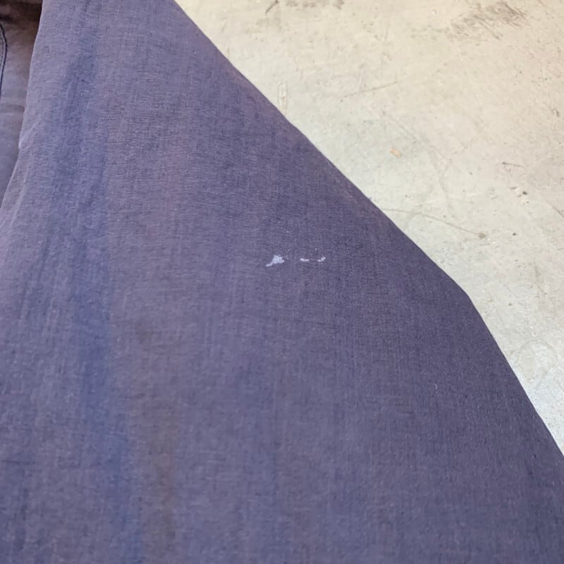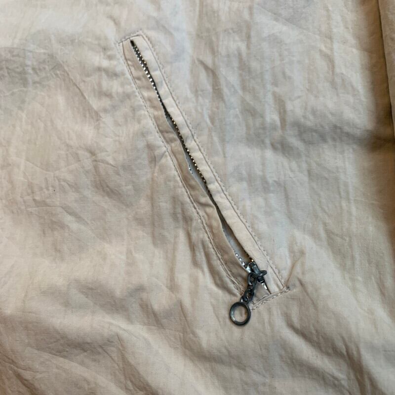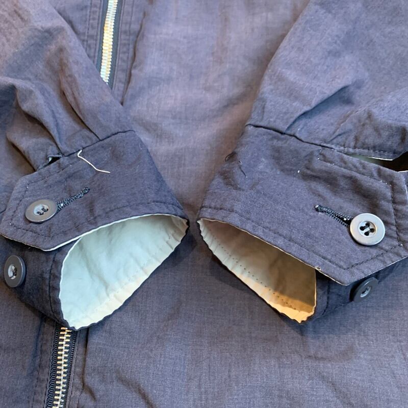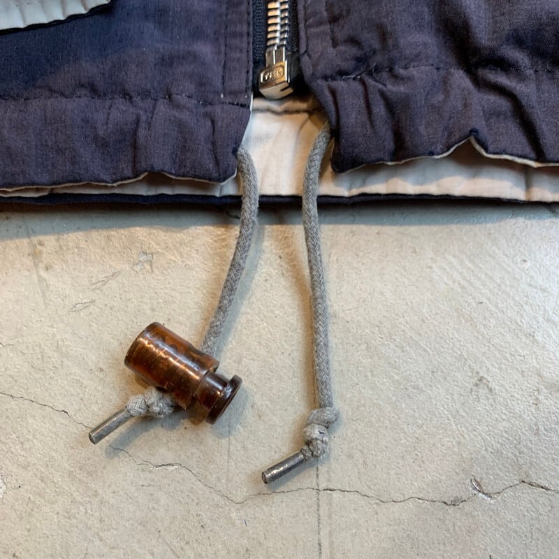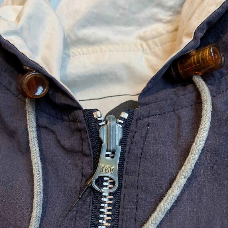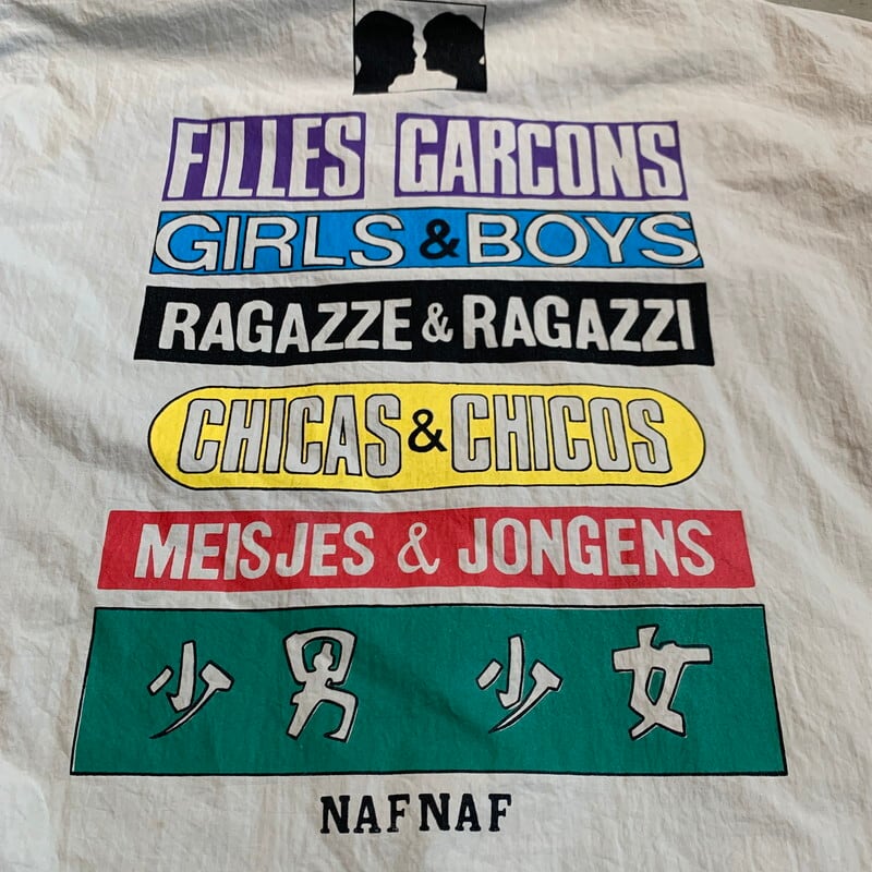 80年代から90年代頃のNAF NAFリバーシブルパーカーです。1973年にフランスで設立されたカジュアルブランドです。コットンポリの素材が使われており、両面とも同デザインで構成されています。GIRLS&BOYSの意味の言葉が6か国語(フランス語、英語、イタリア語、スペイン語、オランダ語、日本語?)でプリントされたデザインです。本来少年少女と書くべき部分を少男と訳されている感じが海外ぽくて良い味出ています。裾のドローコードを留めるコードストッパーが1つ欠損しています。ネイビー側に若干ヤケは見られホワイト側の袖にシミなどございますが、さほど気にならないかと思います。ゴリゴリのヴィンテージではありませんが、探してもなかなか出会わないグッドレギュラーです。ストリート感もあり、ラフに合わせていただけます。個人的にはかなりオススメです。ゆったりとしたサイズでL~XL相当ですが着丈は長くないので合わせやすいシルエットです。