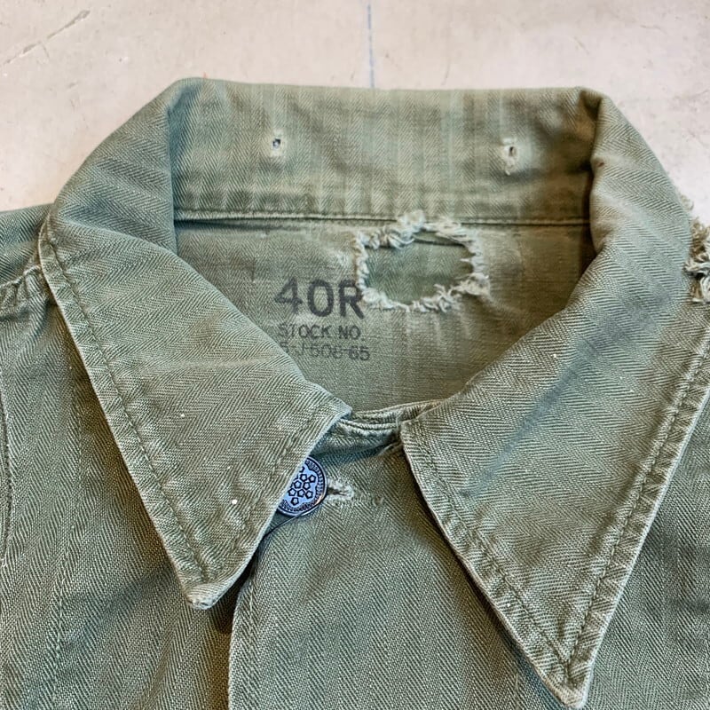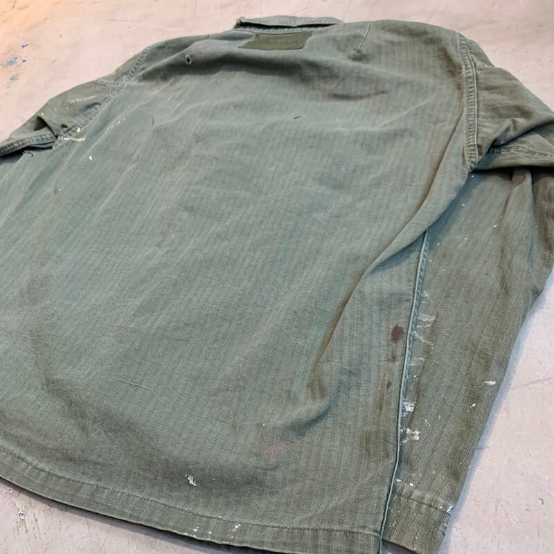 40年代のU.S.ARMY HBTジャケットです。正式名称は、SPECIAL OD-7 HERRINGBONE TWILL JACKET。第2次世界大戦時に兵士たちが着用していたモデルで、生地が丈夫なヘリンボーンツイルを使用しています。ボタンは全て黒ラッカーの13スターボタンです。こちらは一見M-47ぽくみえますが、M-43のようにガスフラップが付きます。ガスフラップにミルスペックが印字されています。しかし胸ポケットにマチは無くやや小ぶりで、M-43とM-47のちょうど中間のようなディティールを持っています。肩幅を詰めたのか、肩から胸に架けてダーツが入るカスタム仕様です。恐らく着丈も少し詰めていると思います。袖や襟、肩等にダメージがございます。ペンキも全体に飛んでおり、ワークウェアとの相性も抜群です。なかなかジャンクですが、ヴィンテージらしい雰囲気がたまらない1着です。お好きな方は是非いかがでしょうか。