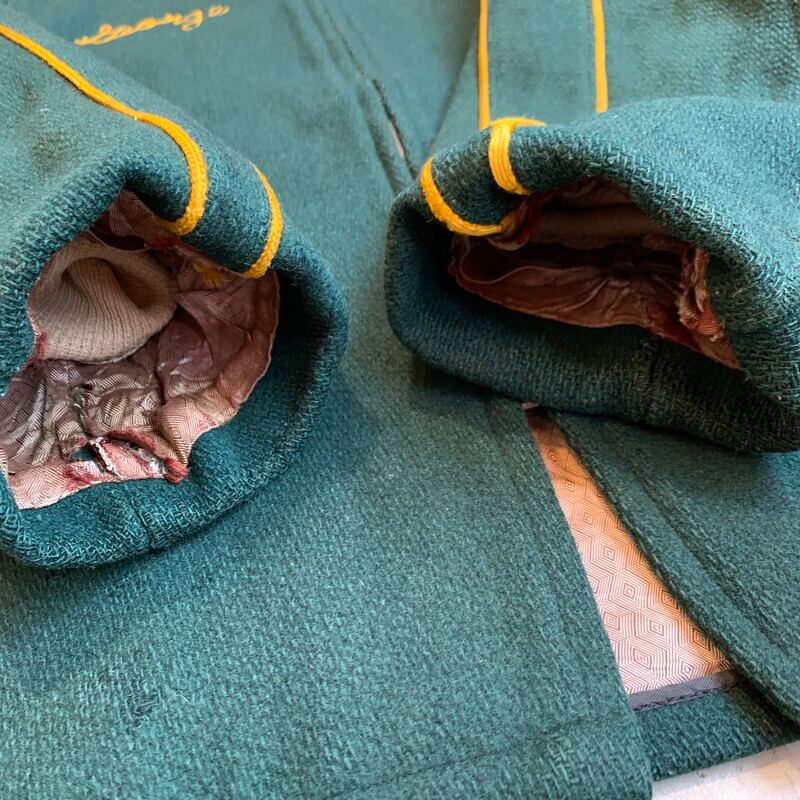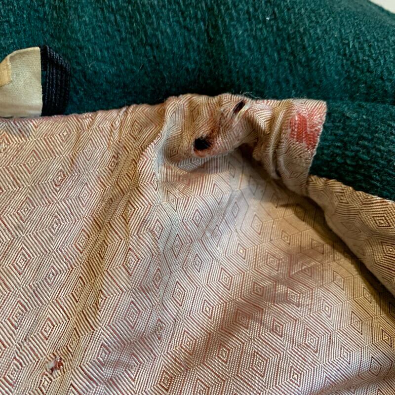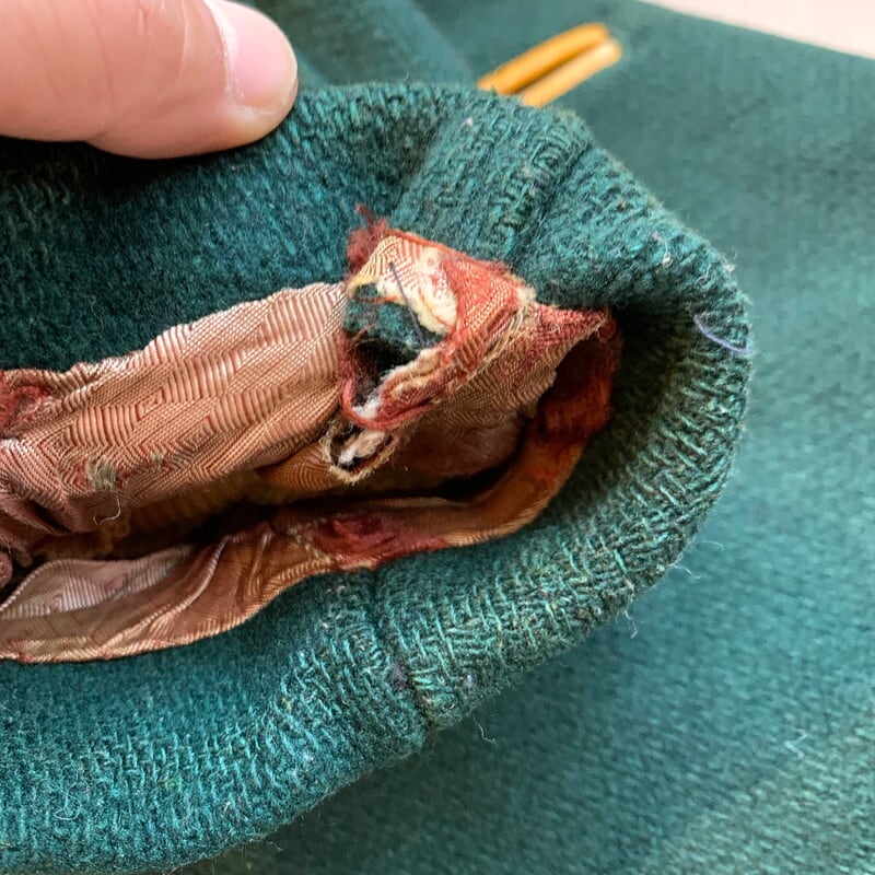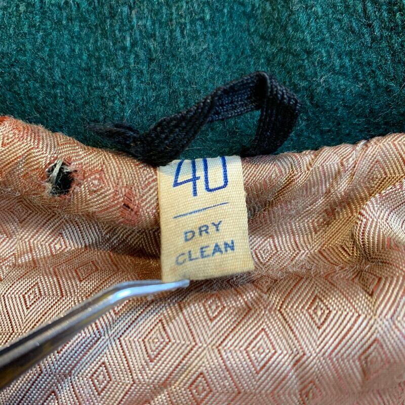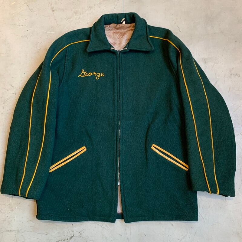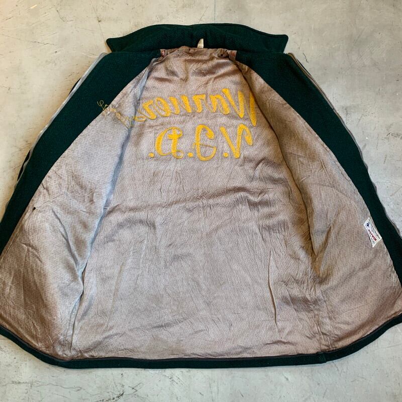50年代から60年代頃のBUTWINウールスタジアムジャケットです。背面に施されたWarner’s V.F.D.のチェーンステッチはアメリカのバーモント州にあるWarnerというローカルエリアの消防団のものです。VFDとはVolunteer Fire Depertmentの略でのボランティア消防士を意味しており、全米の消防士の約7割はこのVFDといわれています。濃いフォレストグリーンのボディにイエローのステッチが映える1着で、裾にリブのないロンスタタイプ。フロントはスナップボタンでは無くアルミのTALONジッパーが使用されています。ポケット淵はレザーです。ライニングは幾何学模様が入ったサテンのような光沢のある生地となっています襟付近のライニング宇うにややダメージがあり、袖口内側も同様のダメージが見られます。表面上は虫食い等ございません。サイズは40でラグラン仕様なので、多くの方が着やすいサイズ感だと思います。カレッジスウェットやヘヴィーネルとも相性が良いので、アメカジファッションがお好きな方には大変オススメなアイテムです。