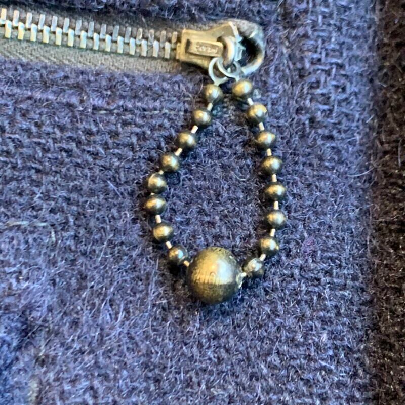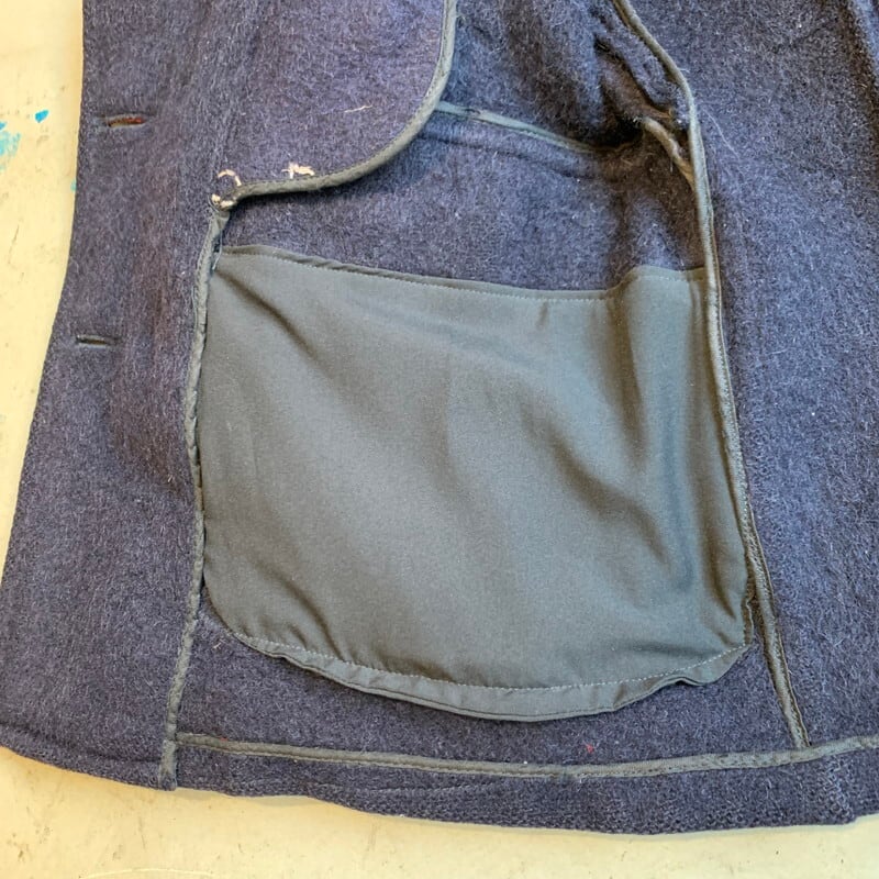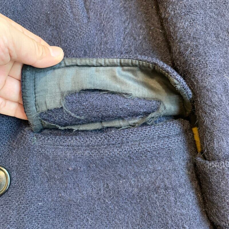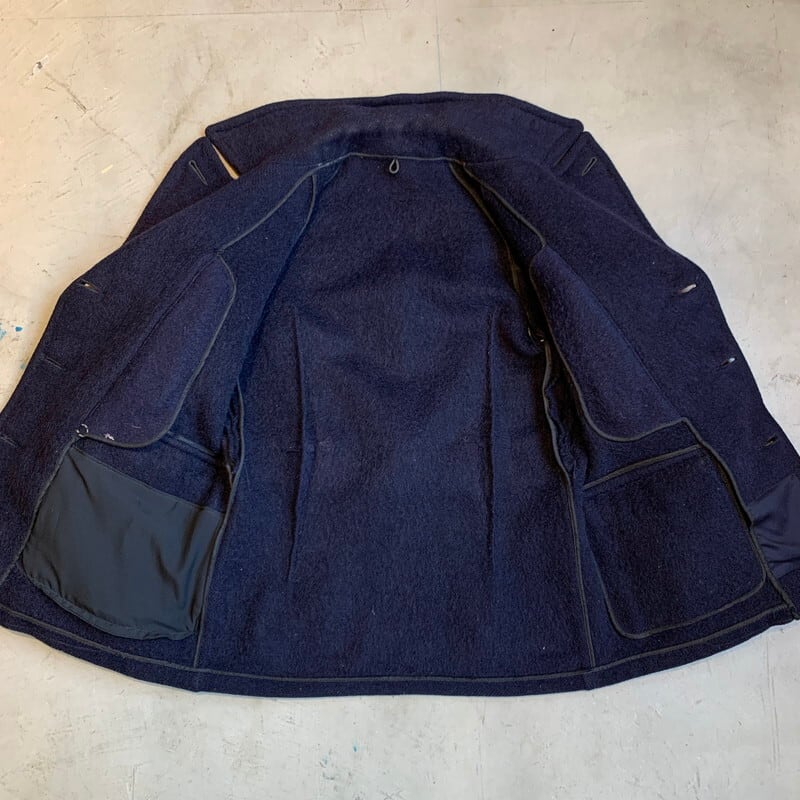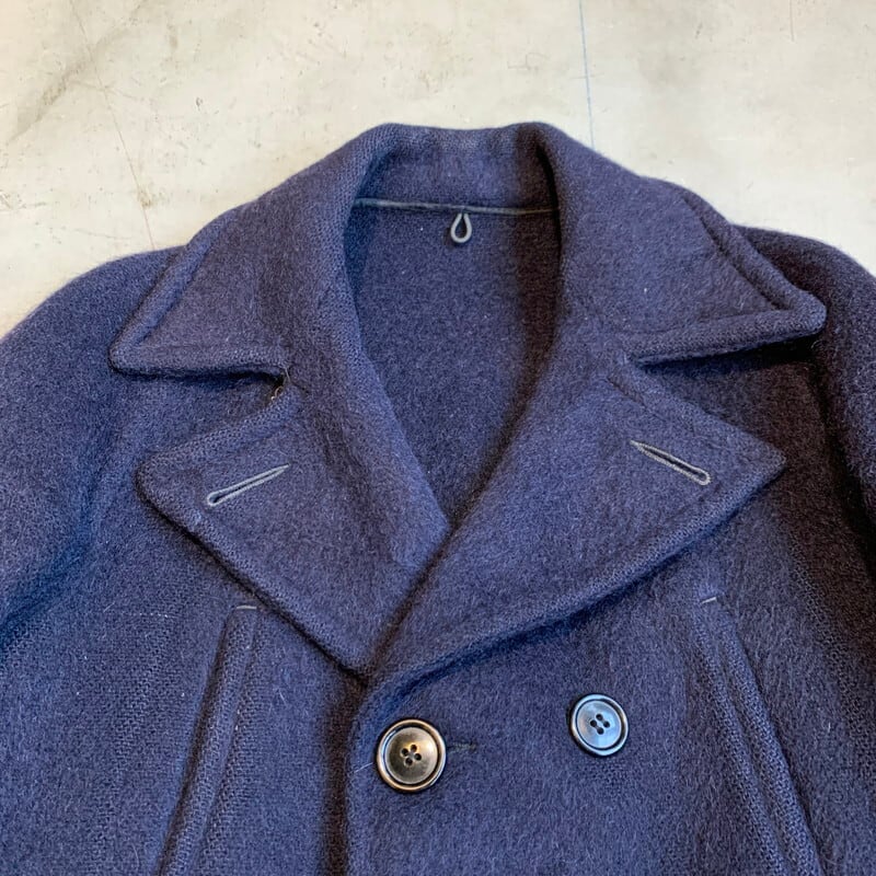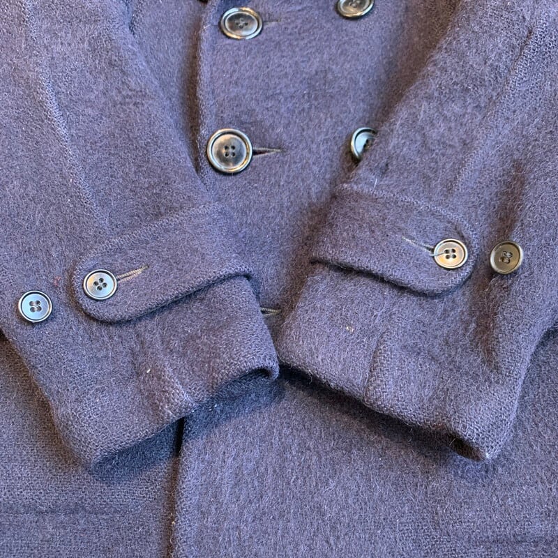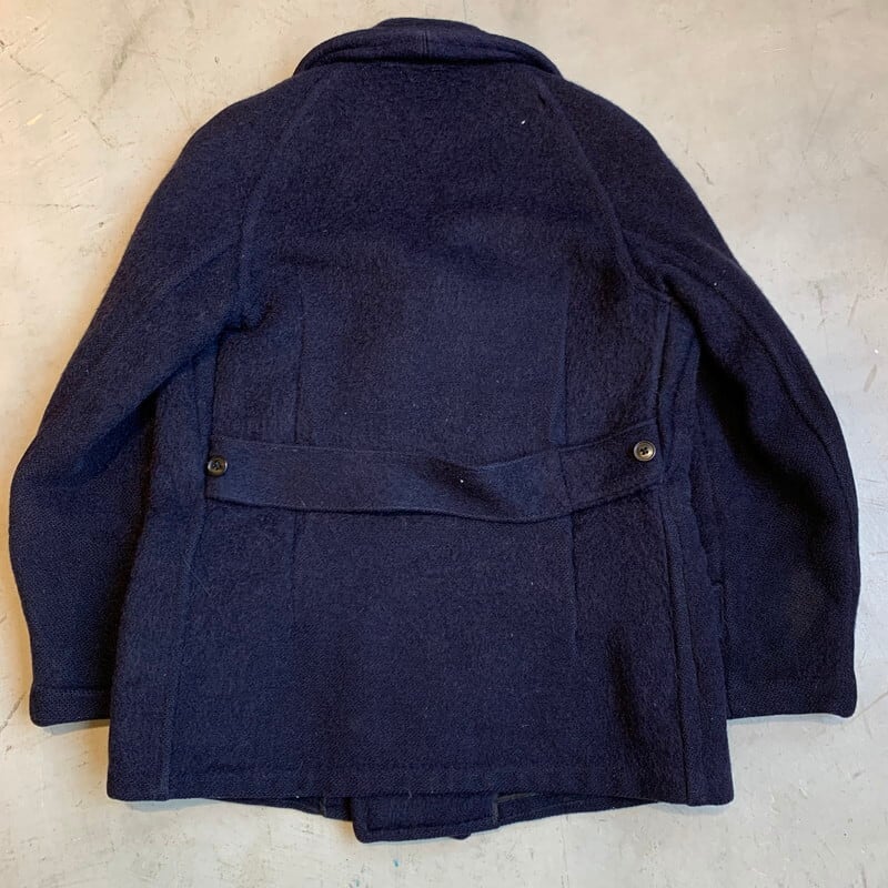 1930年代頃のUNKNOWNダブルブレストウールジャケットです。タグ等が無い為詳細は不明です。やや毛足の長いウールを使用しており、U.S.NAVYのPコートの着丈を短くしたようなデザインです。ハンドウォーマーポケットとフラップポケットの4つポケットにプラス、右の上下のポケットの間にジッパー付きのポケットが施されています。こちらのジッパーはTALONのボールチェーンが使用されています。裏地が比較的新しいので、本来あった生地の劣化に伴いリペアで交換されたものと思われます。前開きの左部分にもリペアで生地が縫い付けられています。所々ウールの毛足が擦れて短くなっている箇所がございますがあまり気にならないと思います。元々ハーフベルト仕様ですが、フロントのベルト部分が欠損しています。以前にこちらのモデルに似た同年代頃のストアブランド物を拝見した事があるので、もしかするとそのようなストアブランドが手掛けていたものなのかも知れません。サイズはM位で形も綺麗なので、合わせやすいデザインです。古い年代物としてはコンディションも悪くないのでお勧めです。