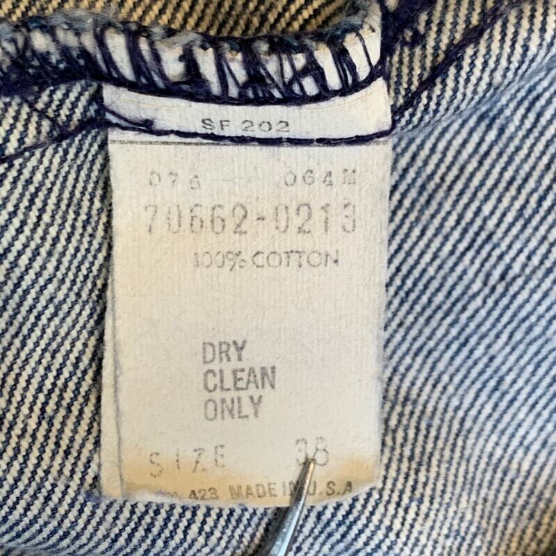 70年代頃のLevi'sデニムテーラードジャケットです。型番は70662-0213。シンプルなデザインながらウエストがシェイプされたきれいなシルエットです。フロントはカッパーボタンにオレンジタブが付きます。背面はセンタープリーツが施されどこかクラシックな雰囲気もGOODです。38表記ですが、タイトな作りなので、普段36を着る方にちょうど良いサイズ感かもしれません。目立つダメージはございませんのでサイズが合う方は是非いかがですか。