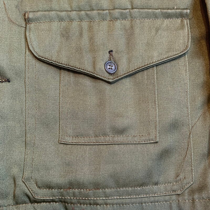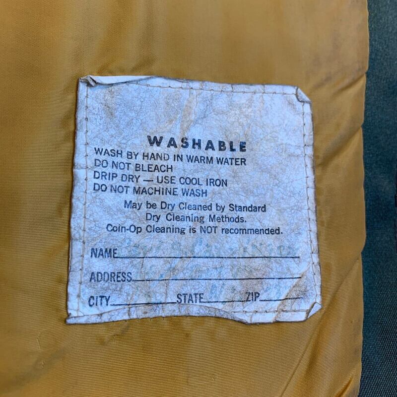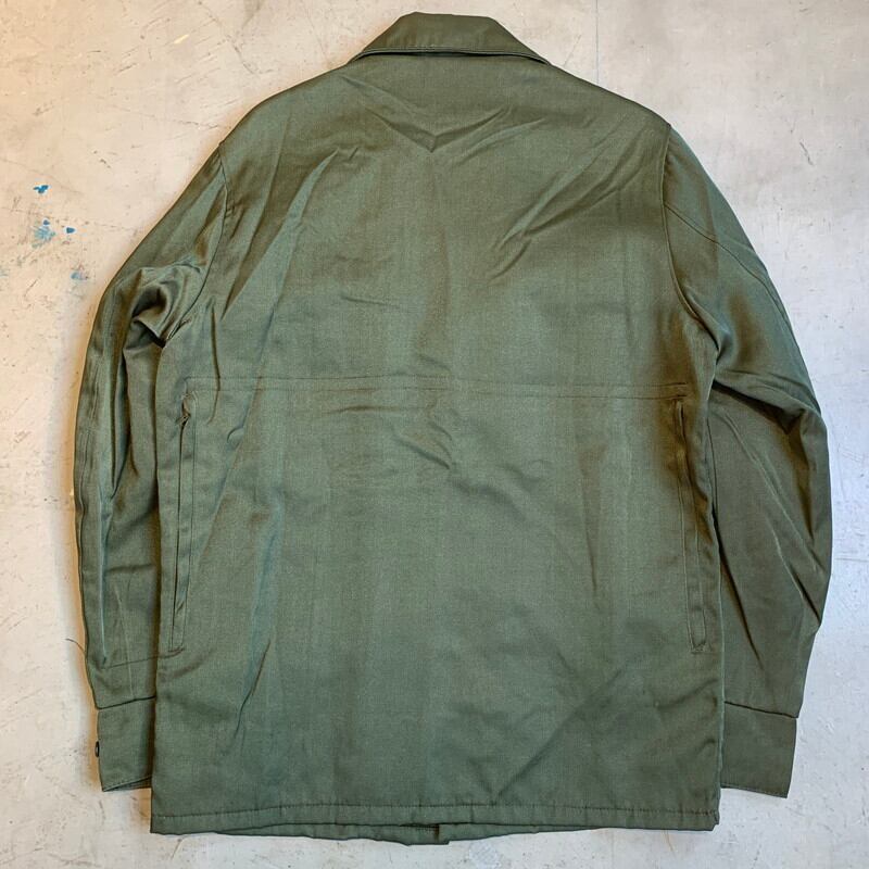 70年代頃のU.S.FOREST SERVICEタイタンクロスクルーザーコートです。アメリカの森林局の職員が着用するアイテムで、Golden Fleece社のタイタンクロスが使用された1着です。難燃繊維のアラミドと違い難燃性はございませんが、通常のナイロンに比べ非常に丈夫で防寒、防水等に優れています。光沢のあるオリーブグリーンにライニングのイエローが映える1着です。元々左袖にはUSFSのワッペンが取り付けられていたようですが、綺麗に取り除かれています。ジッパーは3分の2丈なので、オープンカラースタイルでもご着用できます。背面にはハンティングジャケットに見られるゲームポケットも備わっています。上から第3ボタンが取り換えられており、アームホール内側のライニングにダメージがございます。U.S.FOREST SERVICE関連のアイテムは市場でもあまり出ませんし、こちらのクルーザーコートは特に見つかりにくいアイテムだと思います。サイズ表記44TALLですがアームホールがやや細目な作りですので、体感では40~42位だと思います。マニアックなアイテムがお好きな方は是非いかがでしょうか。
