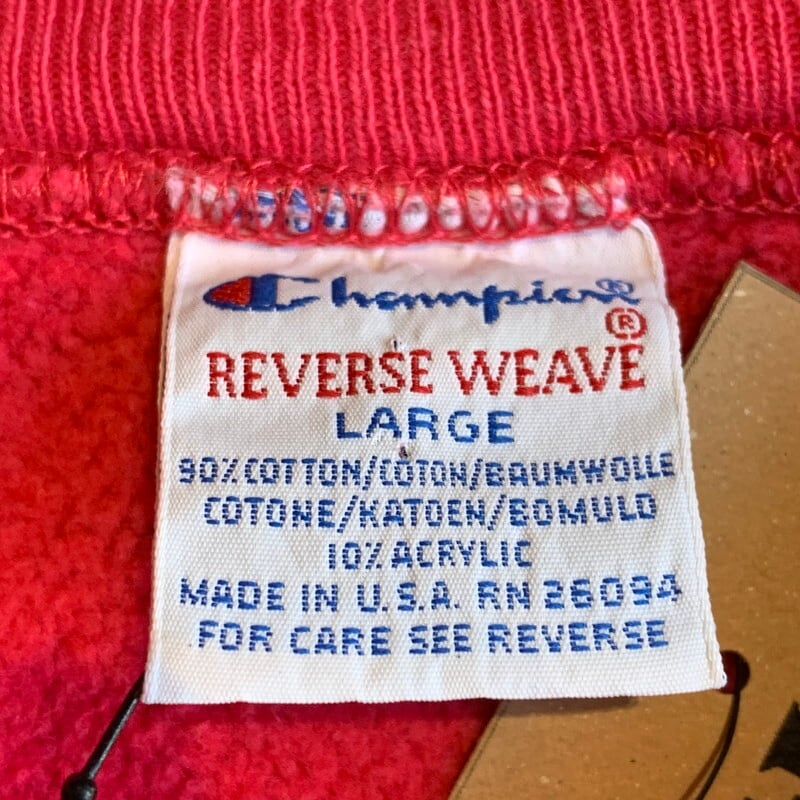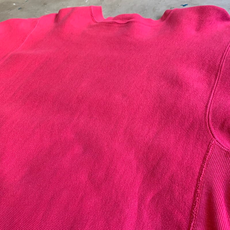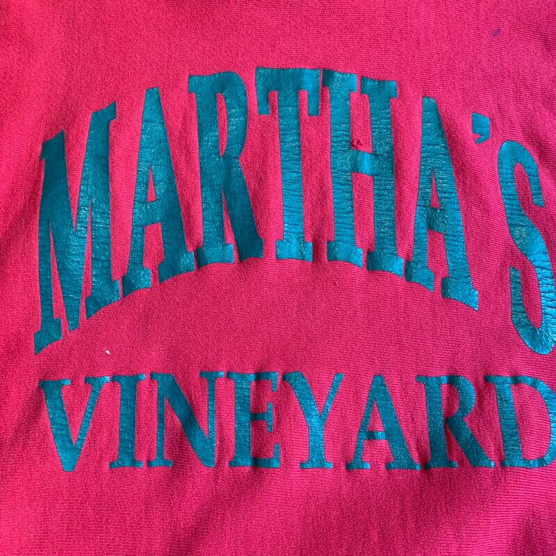 90年代のChampionリバースウィーブスウェットです。マサチューセッツ州デュークス群に属するMartha's Vineyard島のプリントが施されています。恐らくこの島の2校ある高校いずれか(もしくは両校)のカレッジスウェットでは無いでしょうか。発色の良いピンクにエメラルドグリーンのラバープリントが非常に目を惹く1着です。プリント割れや小さなペンキ汚れ、両袖にシミ等があり胸元のプリント付近に1か所小穴がありますが、その他は良好です。リバースウィーブの中でもかなり珍しい配色だと思われます。サイズ表記はLARGE。明るいカラーがお好きな方や、リバースウィーブコレクターの方は是非コレクションに加えてみてはいかがでしょうか。