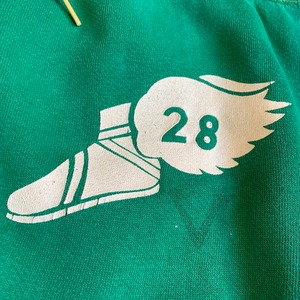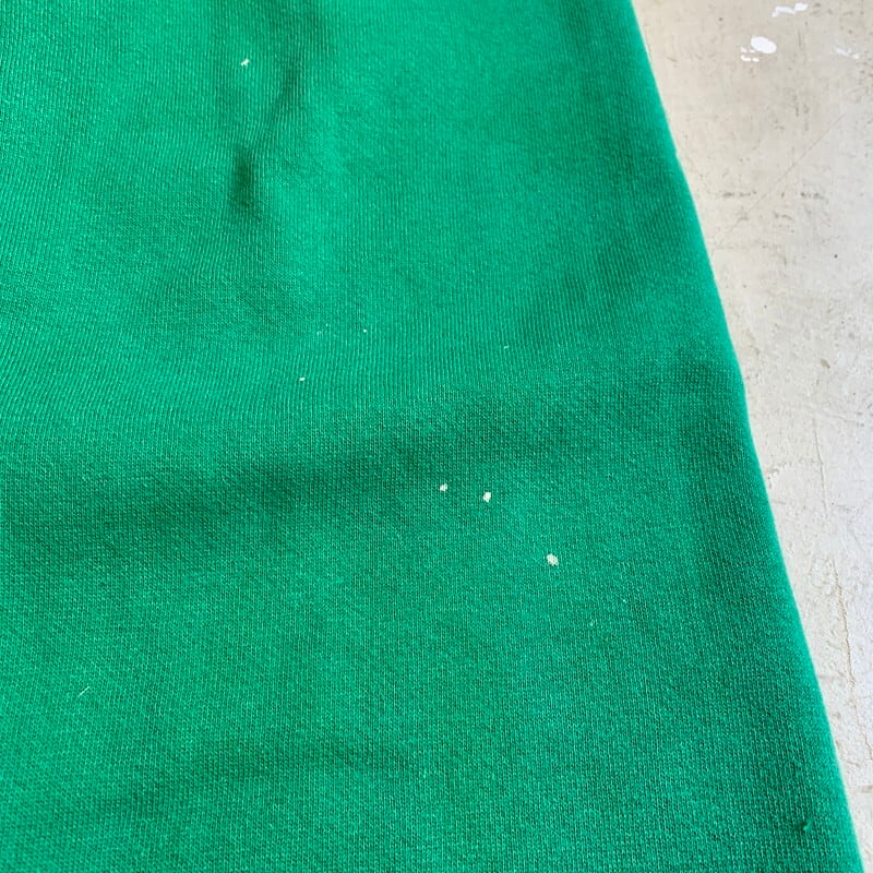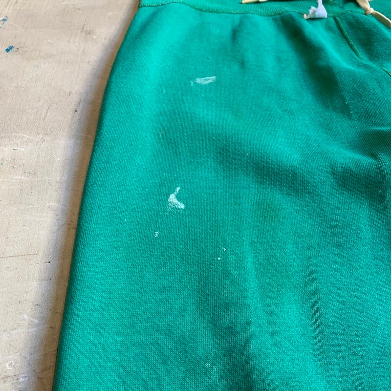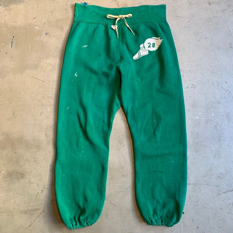 50年代から60年代頃のRussell Southern スウェットパンツです。発色の良いグリーンにウィングフットがラバープリントで施されており、そのすぐ下には染み込みで”V”と書かれています。恐らくVICTORYの頭文字だと思われます。フロントにタグが付く面白いディティールです。全体に使用感があり、シミ汚れやペンキ等が付着しています。ウエストの紐も欠損無く付属しています。ウイングフットはスウェットトップスでも非常に人気のデザインですが、スウェットパンツも同様にお好きな方も多いのではないでしょうか。サイズはL。程よくゆったり着用していただけると思います。カバーオール等のデニムジャケットと相性も良いので、コーディネートのハズシとして合わせてみてはいかがでしょうか。この年代のラッセルのスウェットパンツはなかなか市場では見かけませんので、お探しだった方は是非この機会にいかがでしょうか。