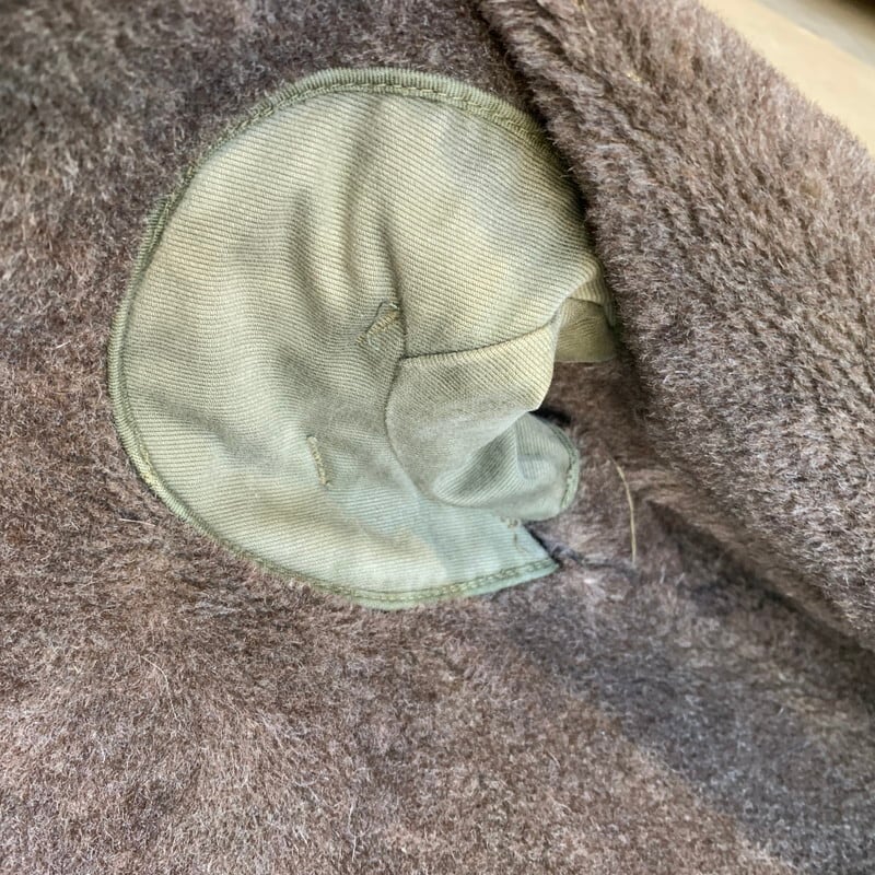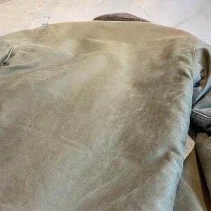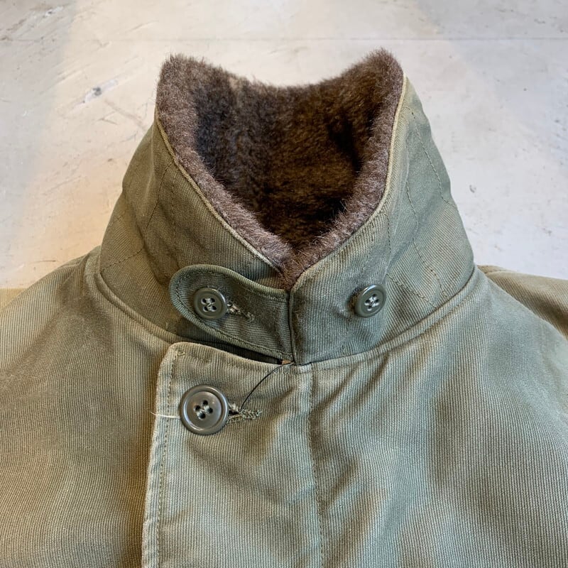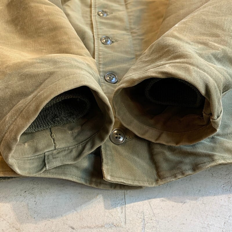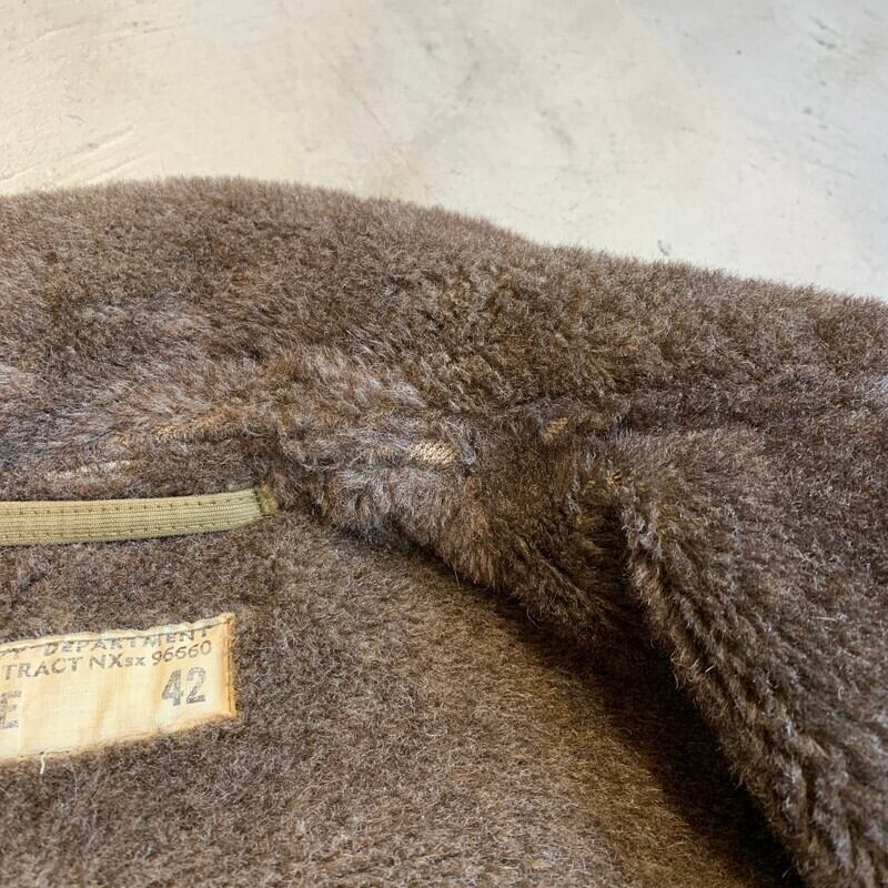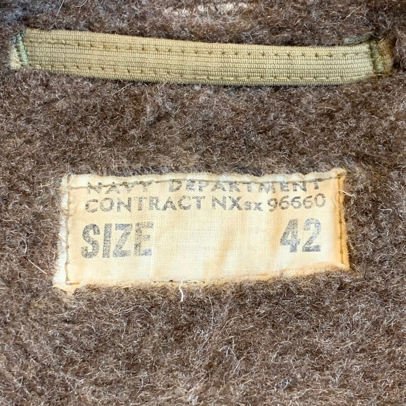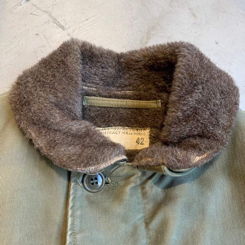40年代頃のU.S.NAVY N-1デッキジャケットです。米海軍の甲板上での作業用として知られ、USNでは1番の知名度を誇るアイテムです。ネイビーカラーからカーキボディに移行したのが1944年頃、こちらはNXsx表記で袖先にアルパカが使用されていないので45年コントラクトの後期型と思われます。裏地は100%アルパカライナーです。フロントはベル型TALONでコの字留め仕様。胸元のステンシルも濃く残っております。襟のアルパカに少し抜けが見られる以外9割以上残っております。擦れや色褪せはあるものダメージが少なく、グッドコンディションと言っても過言ではない極上ピースです。カーキ色がサンフェードでベージュのように褪色したグラデーションが溜まらない1着です。サイズ表記は42。アルパカのボリュームもありますのでr、体感では40位かと思います。まさにゴールデンサイズです。保温性も高くオススメな1着です。当店ではいくつかN-1デッキジャケットを取り扱いしてきましたが、ここまで状態の良い個体は初めてです。コレクションにもどうぞ。