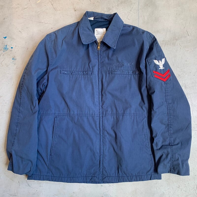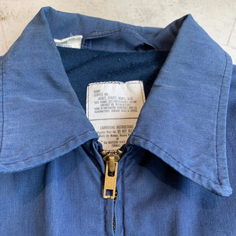 年代頃のU.S.NAVYユーティリティージャケットです。DLA100-89-C-0451。主に潜水艦内で使用されていた為、軽量で動きやすい作りとなります。89年コントラクトのこちらはユーティリティージャケットの後期型で、フロントがジッパータイプとなります。左腕にワッペン、胸元と内側裾にステンシルが入ります。無駄を排除したようなシンプルなデザインですが、胸元にステンシルが入ることでグッとポイントが上がる1着だと思います。多少の使用感はございますが、ダメージ等なく比較的状態良好です。サイズは42Rですが、170cm70kgで中にスウェットを着てビッタリジャストです。ミリタリーアイテムとしては大き目な作りでは無いのですっきりしたシルエットで合わせていただけると思います。