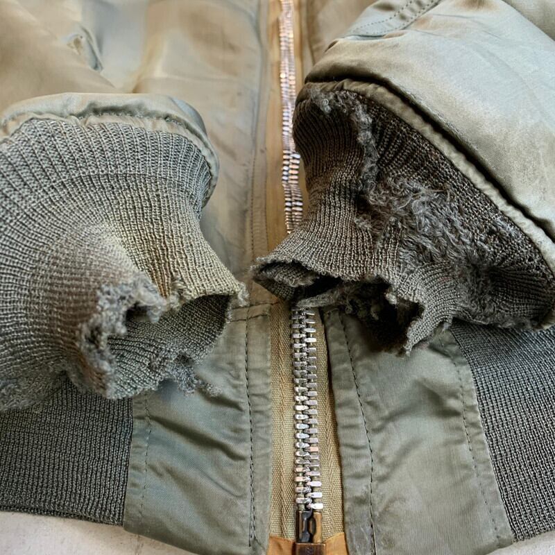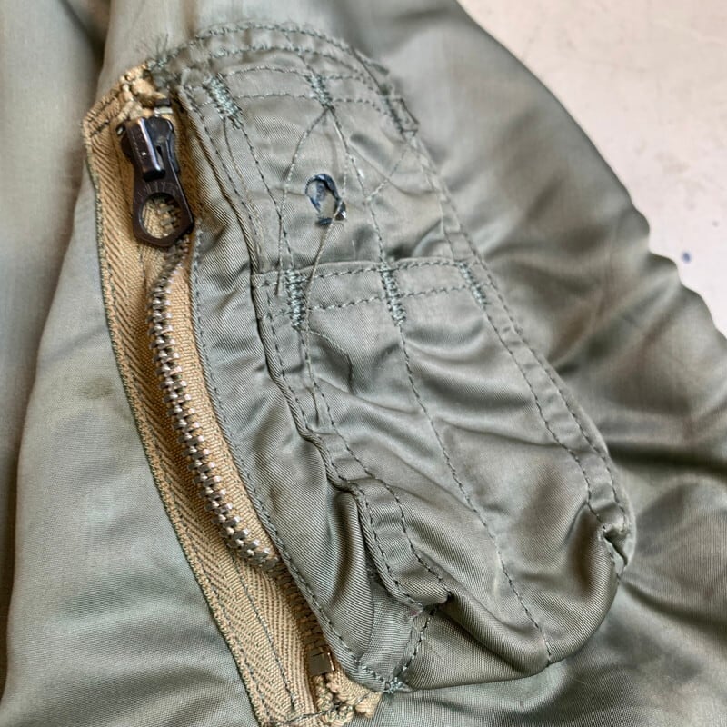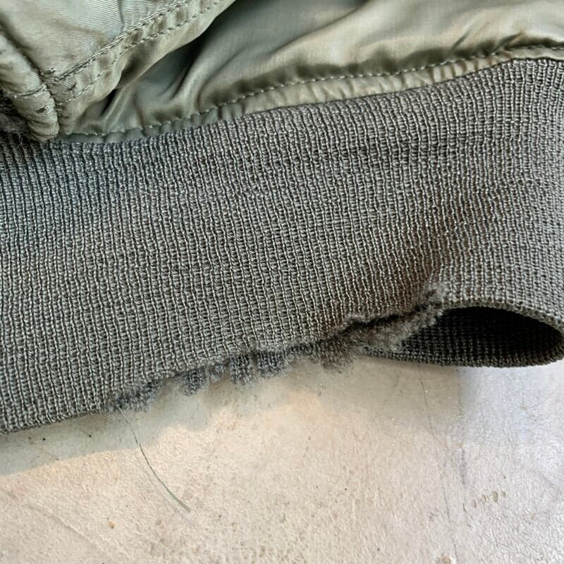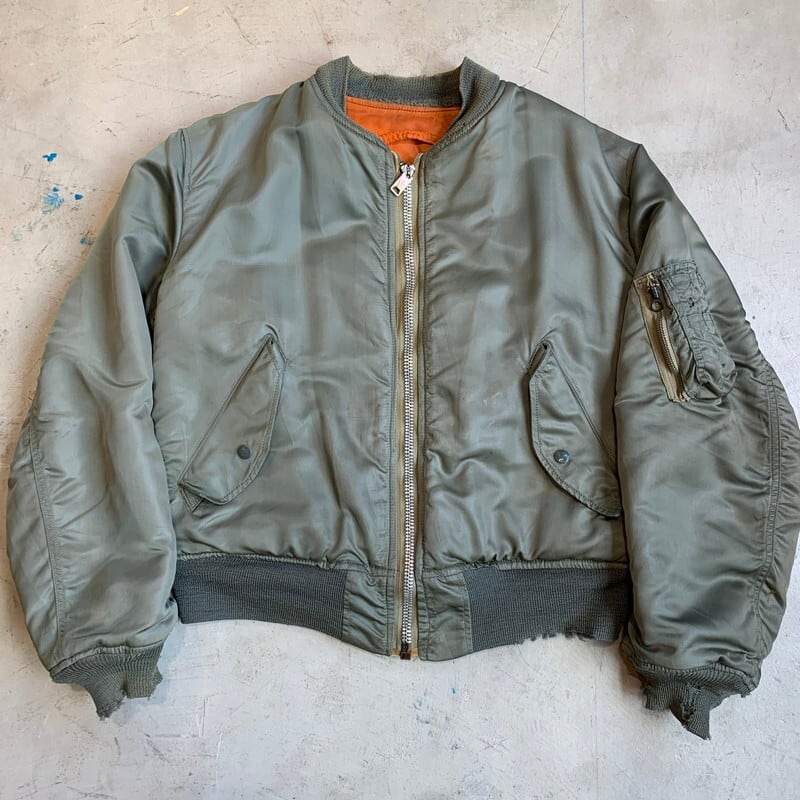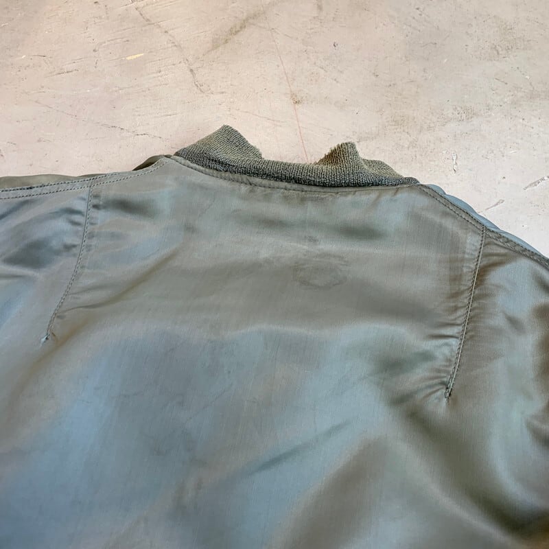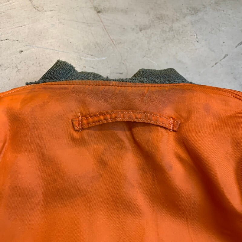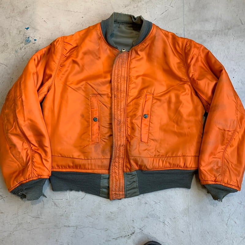 60年代頃のUSAF MA-1フライトジャケットです。ポケット内のミルスペックは印字が消えてしまっているので詳細は不明です。裏地がサテンからナイロンへ変わったあたりのモデルと推測しています。全体に使用感が有り、リブにはすべてダメージが見られます。シガレットポケットにはタバコ焼けのよう跡も見られます。左袖に小穴もございます。両面ともヤケや汚れがございます。状態的にはグッドコンディションとはいきませんが、サイズ感が良く合わせやすい1着です。裏面のオレンジ面をメインに合わせるとコーディネートの幅も広くなるので、お勧めです。リブのパンクもアジですが、気になる方はリブ交換されても良いかと思います。サイズはL位。ゴリゴリのアメカジスタイルはもちろんですが、新旧合わせた古着ミックスなスタイルでも使い易いアイテムだと思います。状態特価ですので、是非いかがでしょうか。