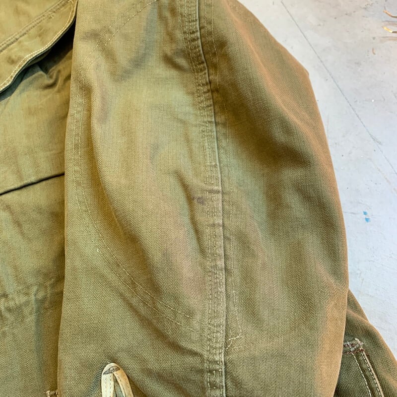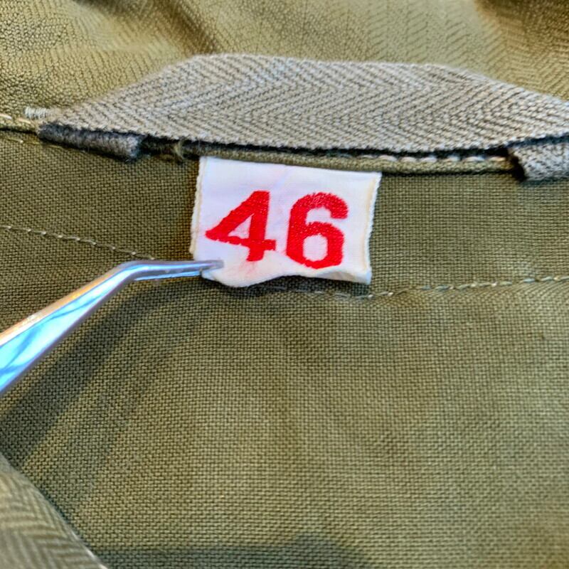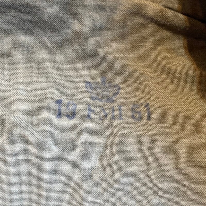 60年代のデンマーク軍M-58フィールドジャケットです。米軍のヘリンボーンツイル地に比べ幅の狭いヘリンボーン地が使用されています。斜めについたフラップや袖口のパイピング等非常にデザイン性の高いアイテムです。70年代以降には肩にエポレットが付く仕様に変わりますので、エポレットが苦手な方には大変オススメです。生地がすべて2重構造となっており、荷物を運んだりする際一番負荷のかかる肩周りには中綿と丸紐を埋め込んであり強度を高めています(デンマーク軍のフィールドパンツのダブルニーと同じ仕様)。内側腰部分には大きなポケットも配備されています。ウエストのコードでシルエットも変えられます。擦れ等ございますが、ダメージは無くコンディションは良好です。ユーロミリタリーの中でもあまり出ないアイテムですので、お好きな方は是非この機会にいかがでしょうか。